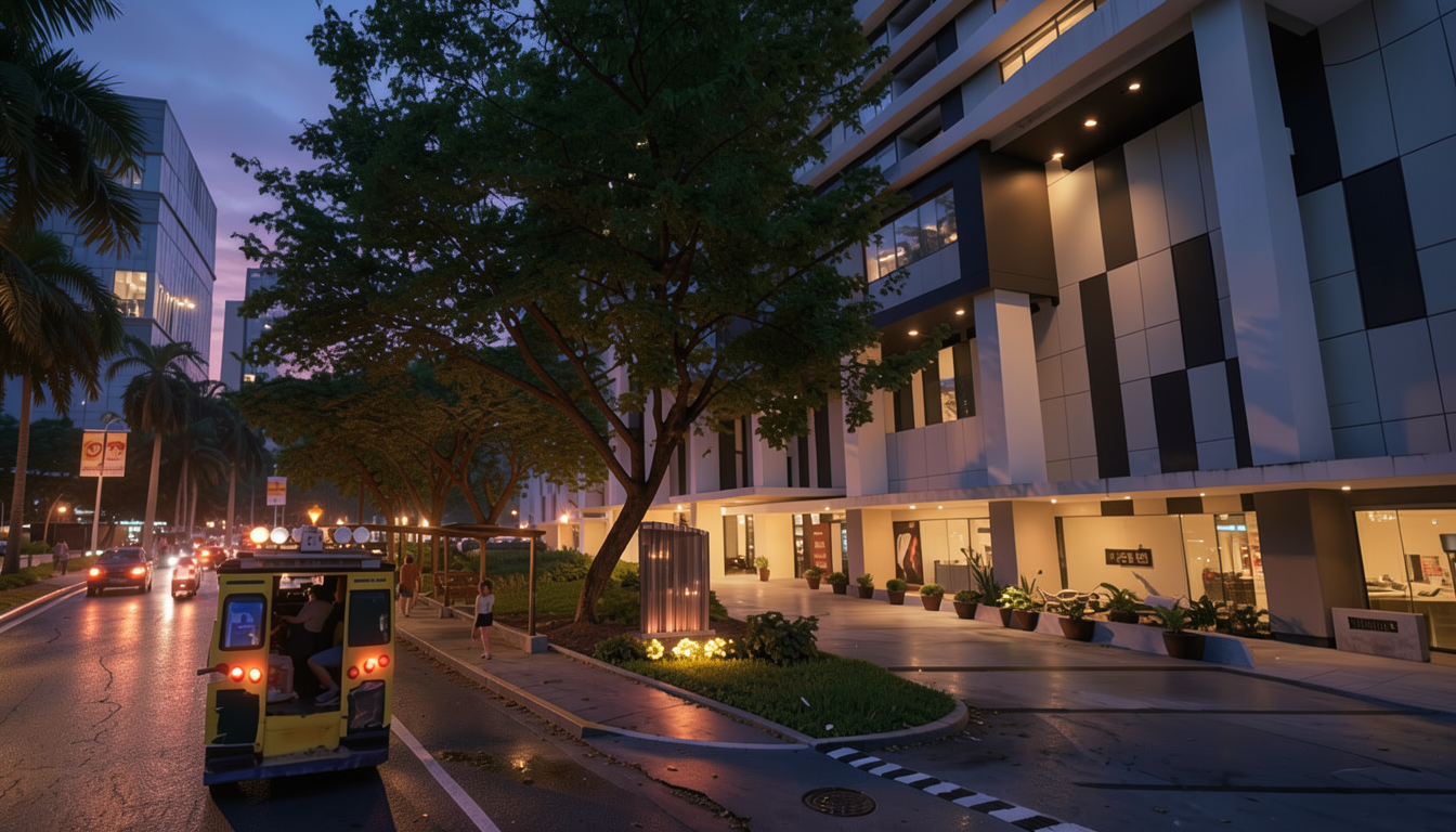 modernist interior from the top modern interior from the top change and modify the materials in the existing photo to modern contemporary materials in warm gray tones and match the following for the walls and columns polished plaster in light greige for the floors 600x600mm porcelain tile in light grey beige match the walls and columns for the wooden doors natural wood in tanguile for the railings make the tempered glass reflective and the railings matte black only on the second floor make it cinematic photorealistic 4k resolution 16mm camera lens balance the artificial lighting and brightness suited for a lobby and sunset daylighting but only on the part with the garden architecture looks like a real estate photograph not a 3d render architecture