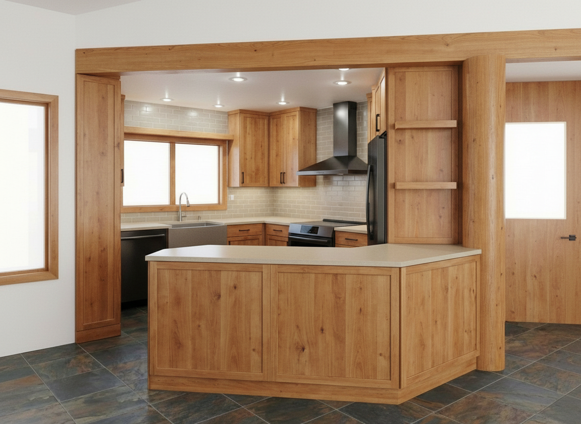 render a serene outdoor patio scene with a modern design the sky is a clear vibrant blue creating a calm and inviting atmosphere the overhead pergola is a sleek charcoal gray providing a stylish and shaded area the dining table features a natural wood finish with an elegant warm tone complemented by black wicker chairs with light tan cushions the grill is a stainless steel silver reflecting a pristine and polished look cushioned lounge chairs with muted beige upholstery are nearby fostering relaxation lush green plants add a touch of nature creating a fresh and lively atmosphere set during the day with bright natural lighting that enhances the entire space as background a florest with mountain