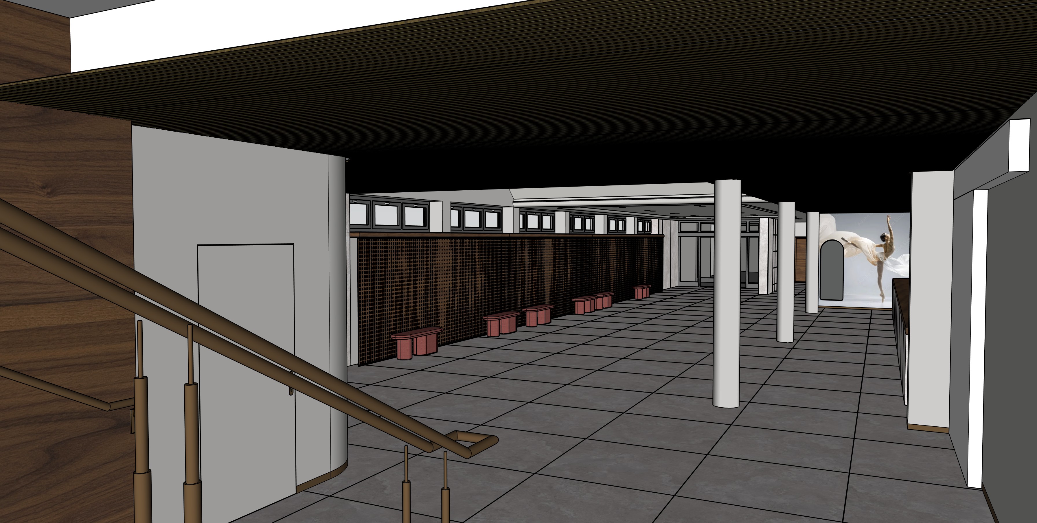 modern cultural building foyer interior warm light from window elegant people copper handrail perforated wooden panels with led light textil bench light interior matte floor led inside the ceiling led between lamellas spotlights pleasant atmosphere