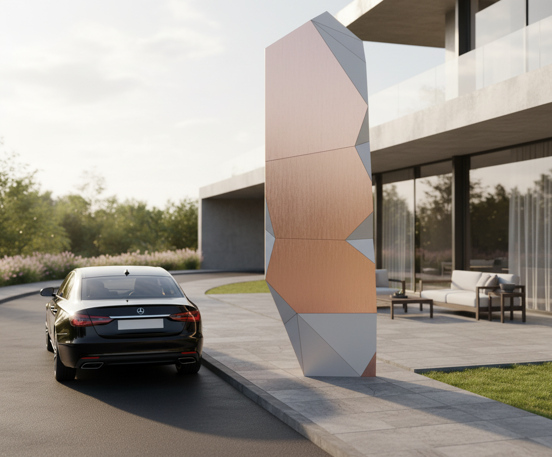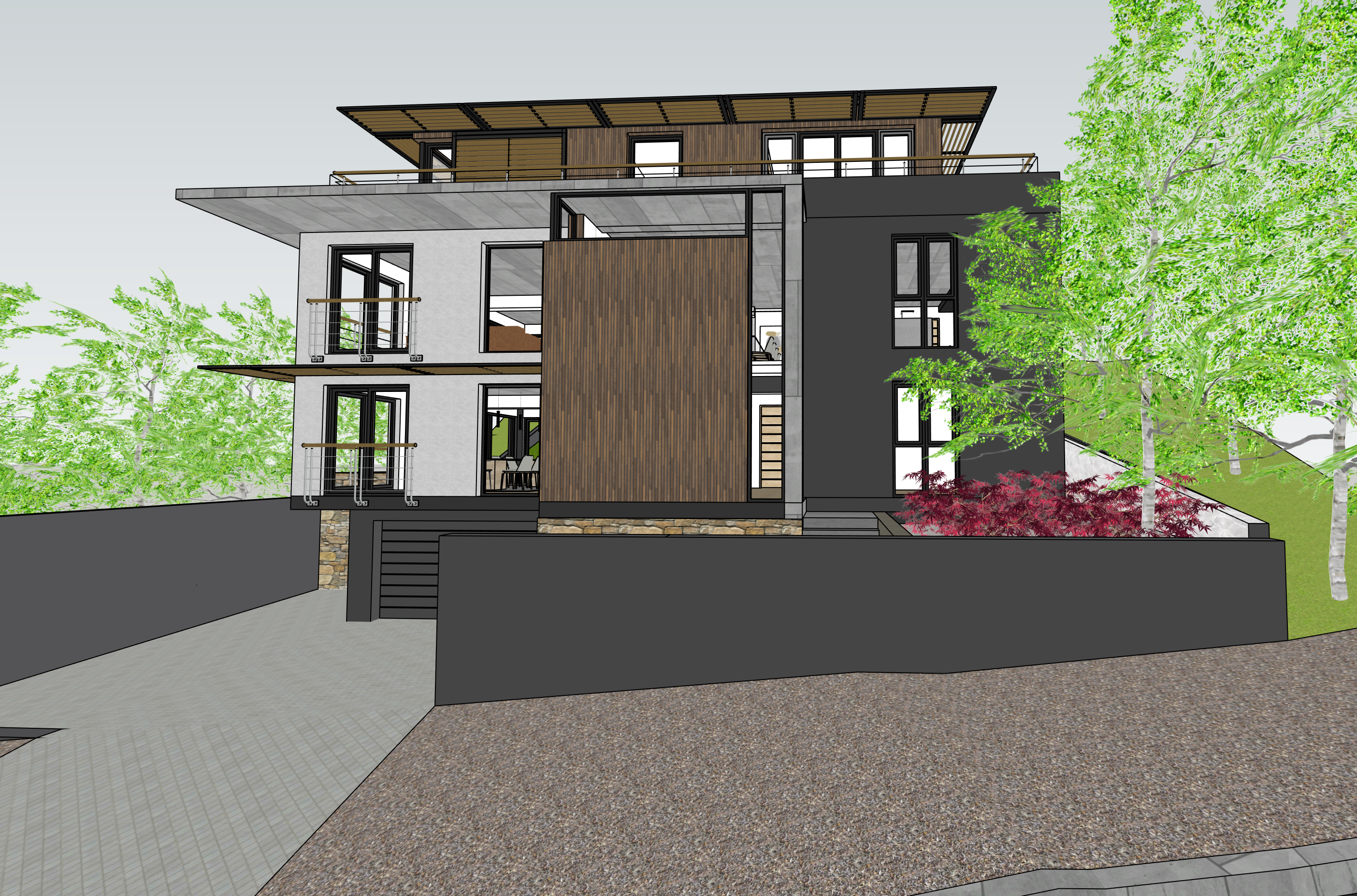 exterior shot a modern luxurious three story urban villa surrounded by lush vibrant green trees the building features sleek gray exteriors contrasting with rich wooden accents on the upper floors the large glass windows are framed in dark metal reflecting a clear blue sky the driveway and garage area are paved with light gray tiles complementing the dark gray of the retaining walls a stylish white suv with black rims is parked at the entrance the atmosphere is serene and sophisticated set in a tranquil upscale neighborhood with a soft golden sunset casting warm hues across the scene architecture