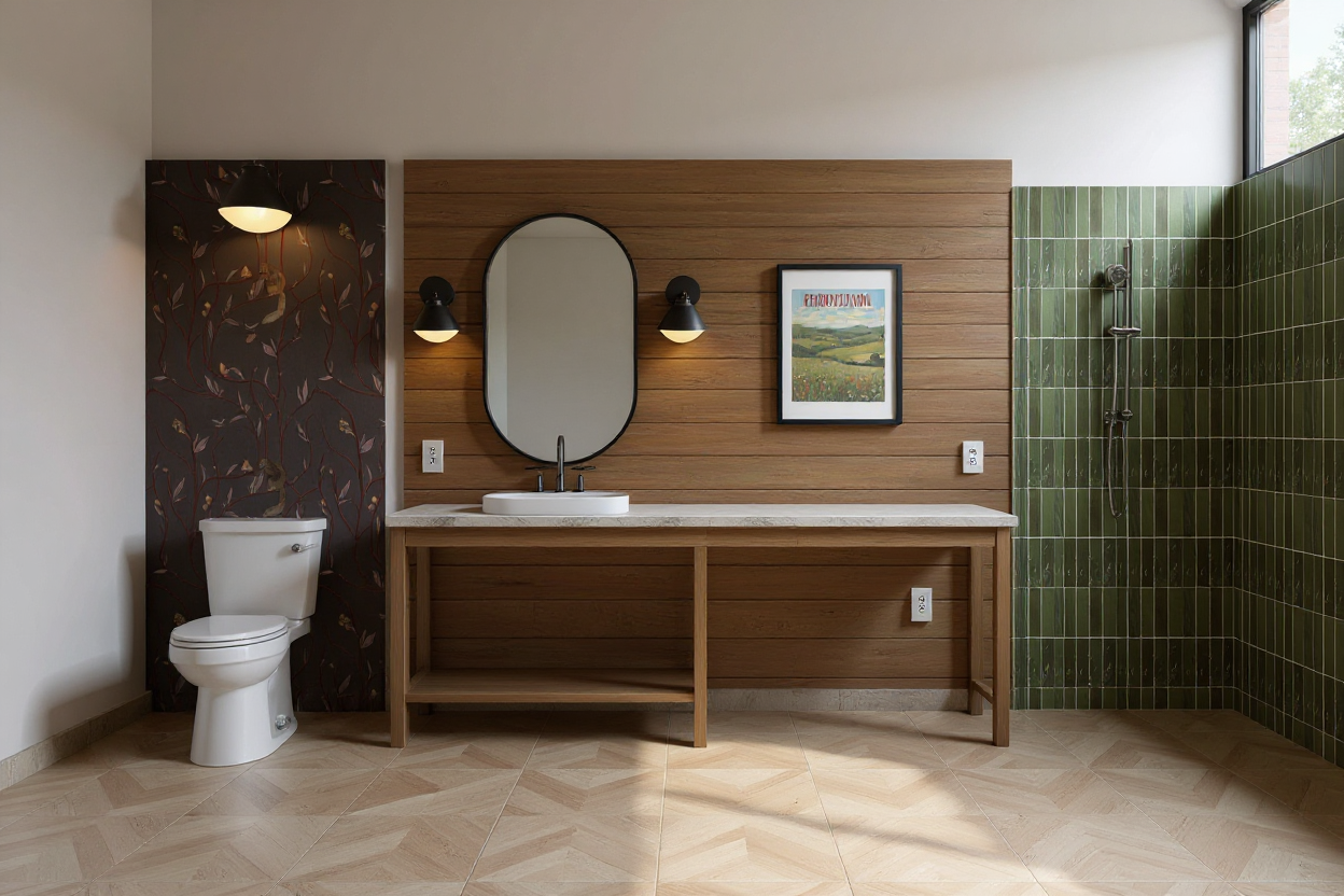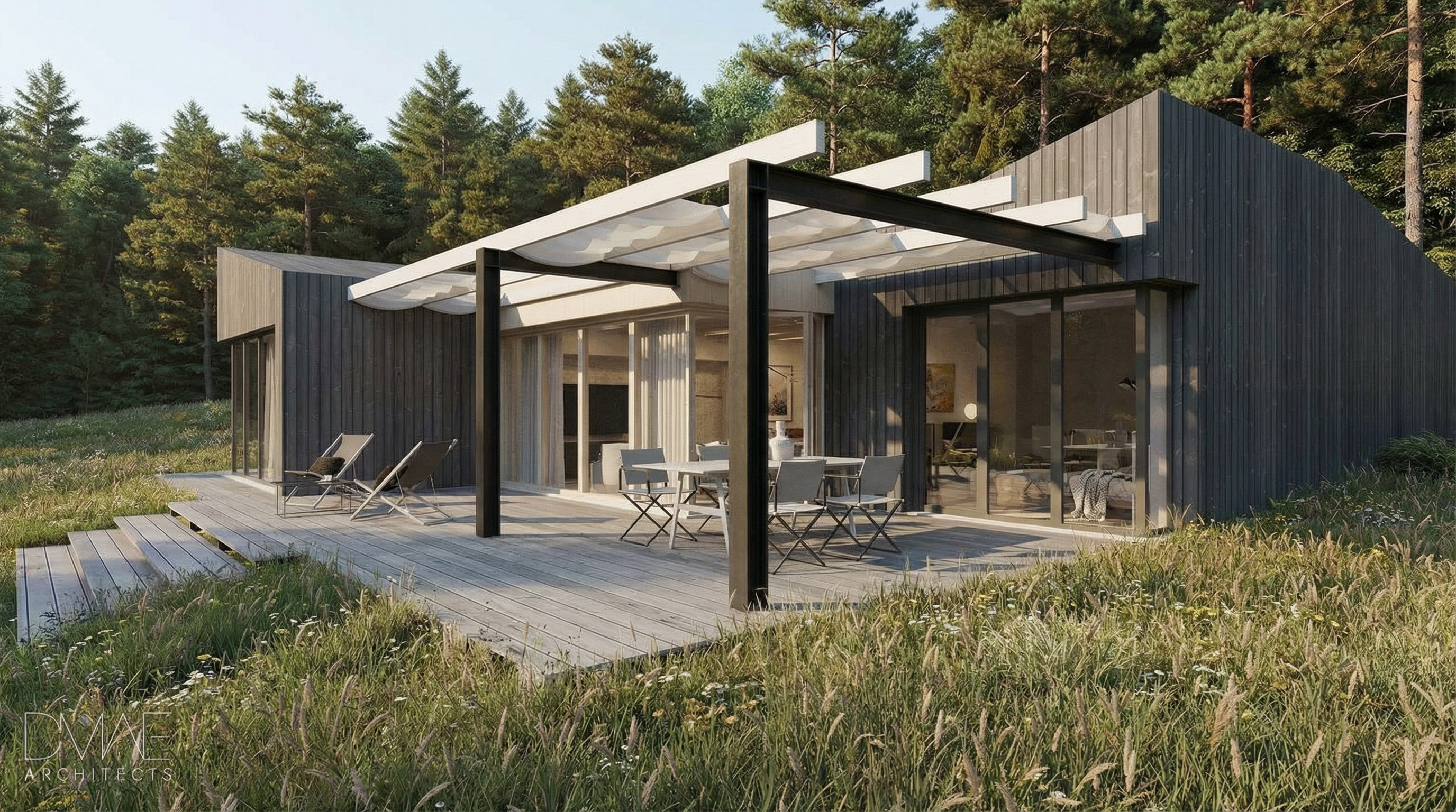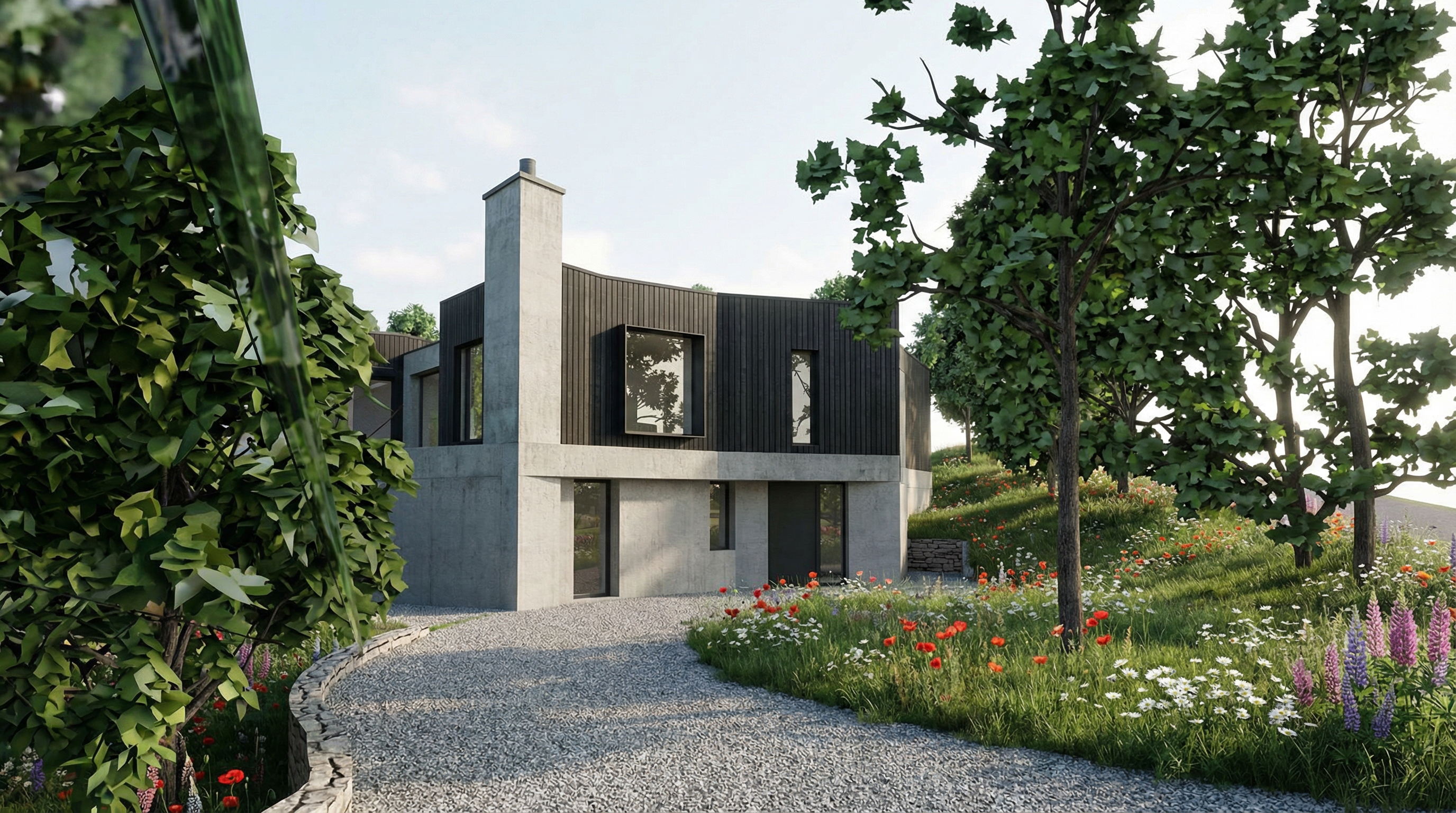 do not change perspective and proportions of image or the curved black wall at first floor level add a small amount of wild flowers to some of the grass areas add vertical black modern cladding to the upper level dark walls