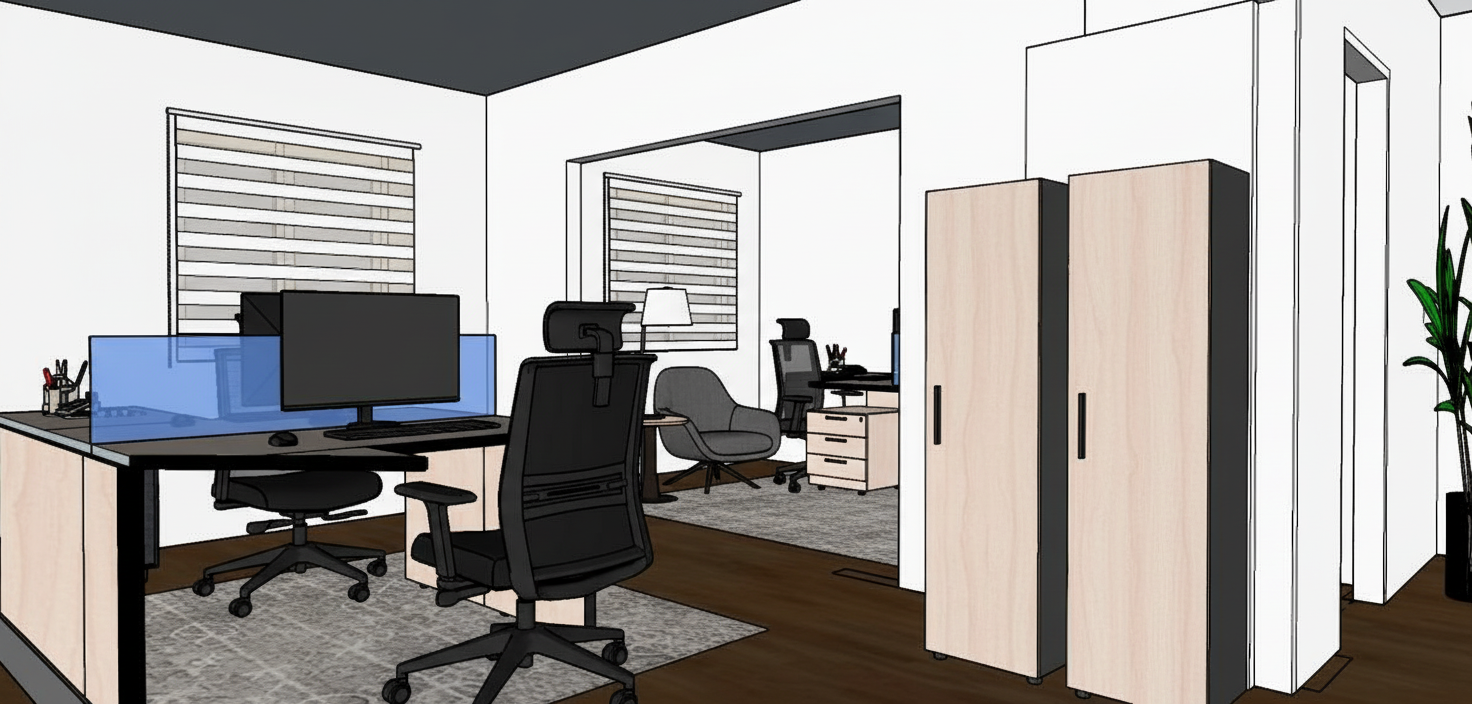 realistic rendering of this bedroom white blue curtains in the front of the big wood framed window and white door