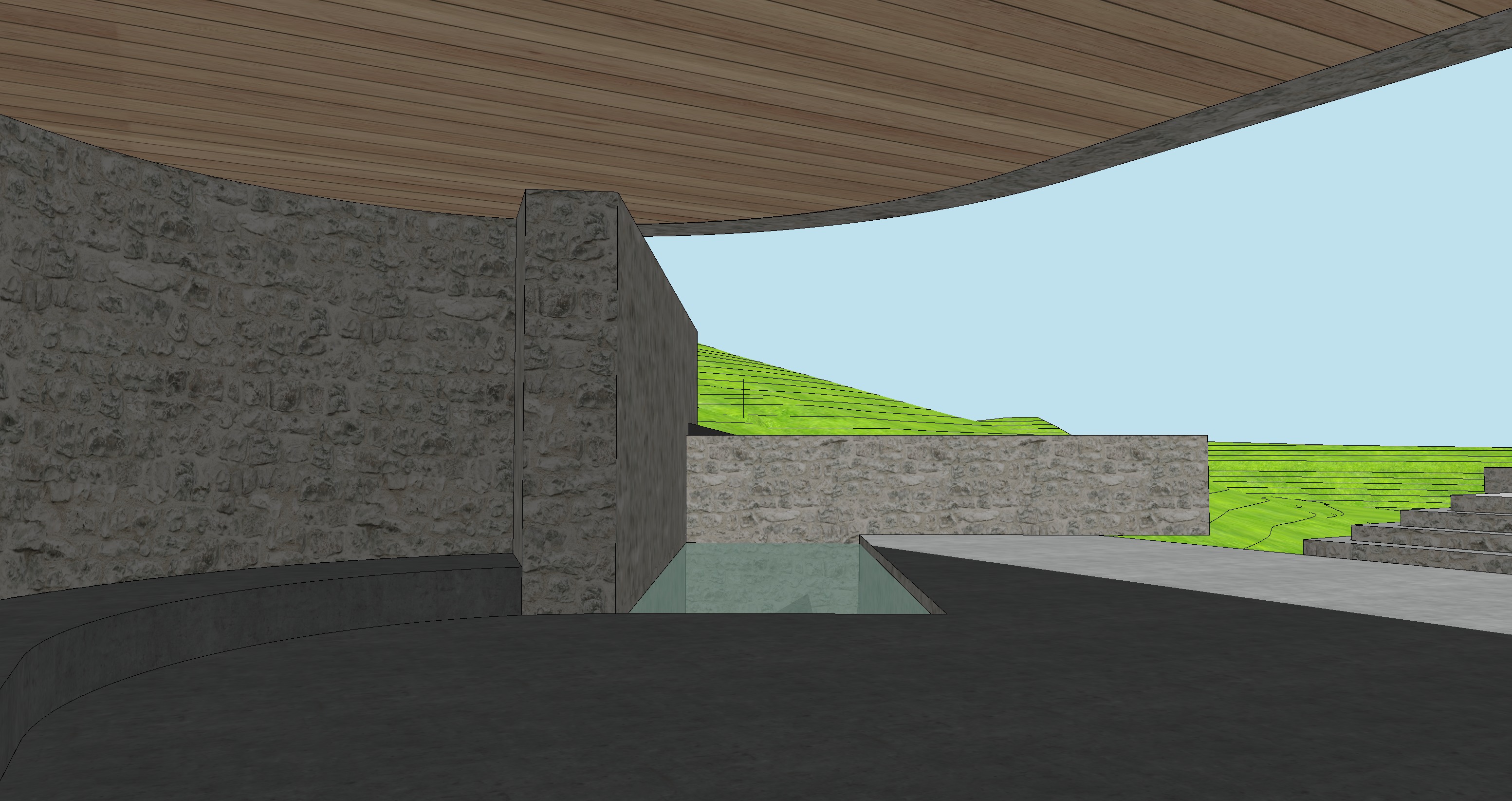landscap hillside with sagebrush and tall wild grasses brown drystack stone walls flagstone patio cushions of curved bench dark water in spa with a person in it dusk