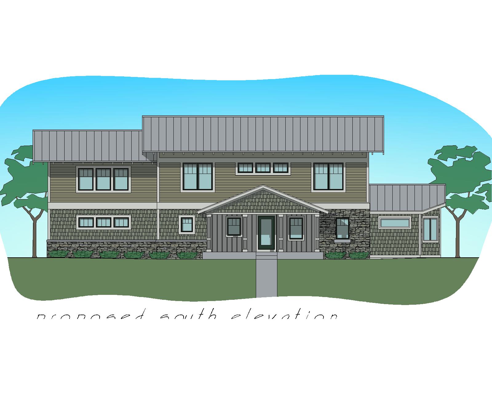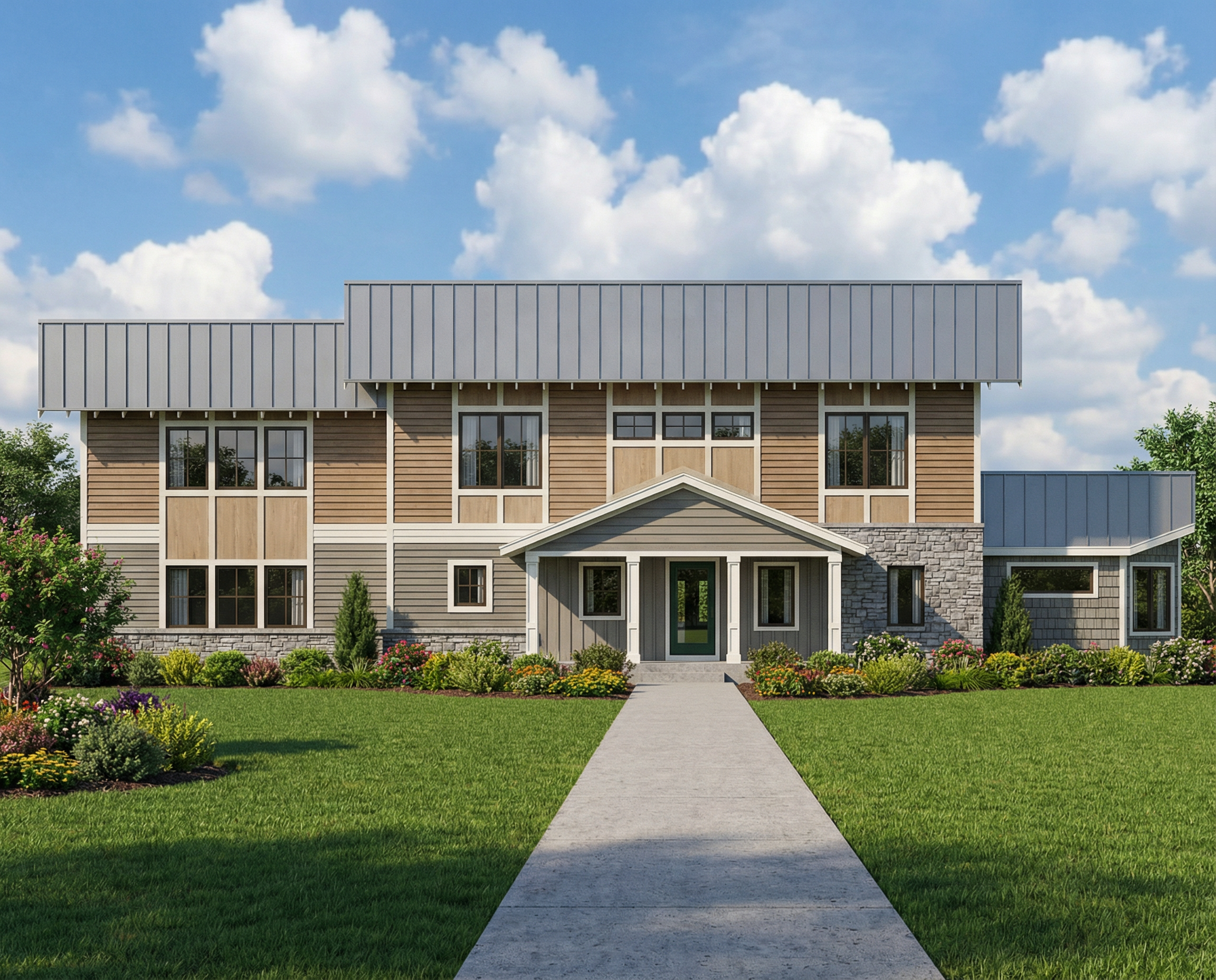 create a beautiful photorealistic rendering of this homes front elevation complete with lush landscaping crisp sunny fall day