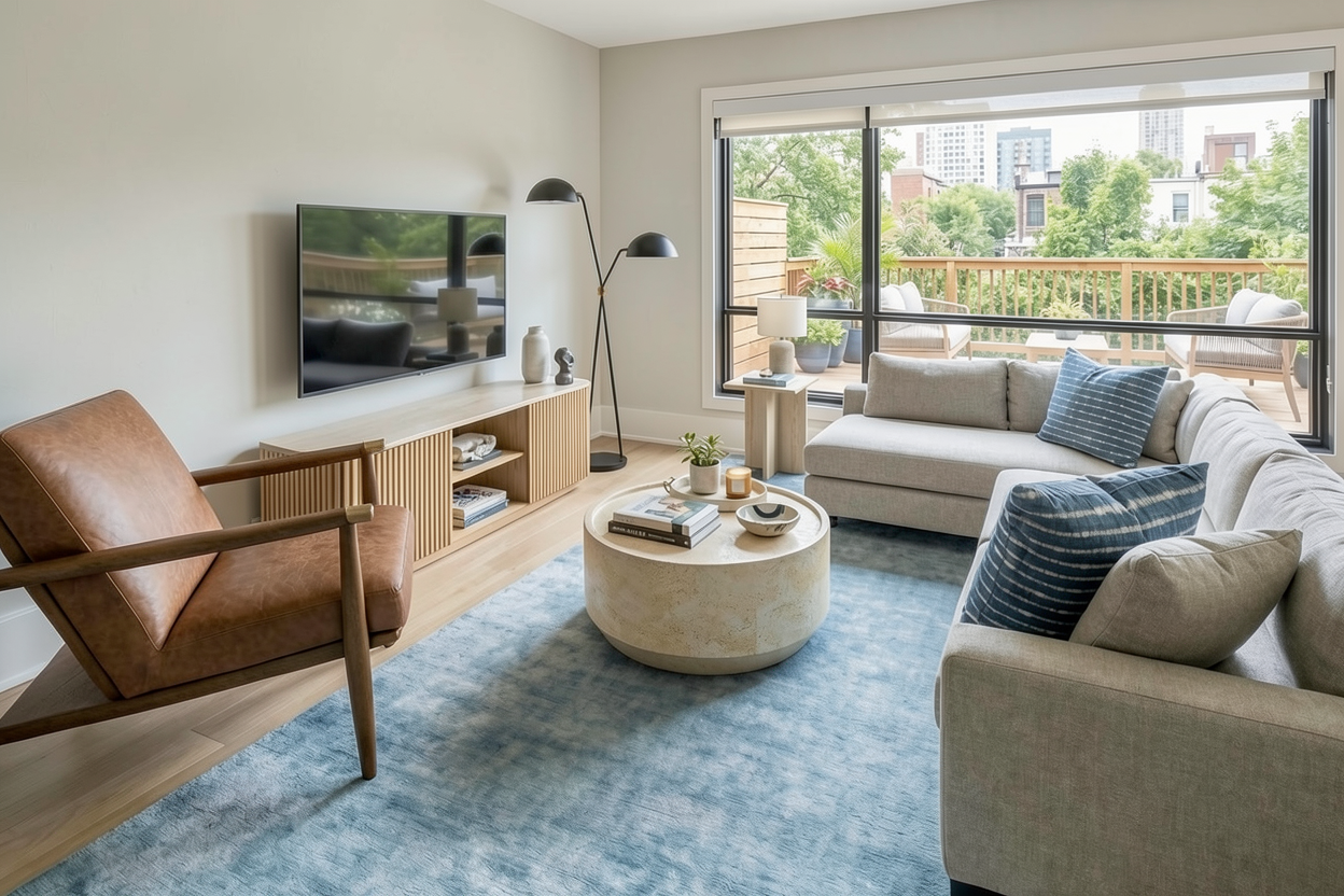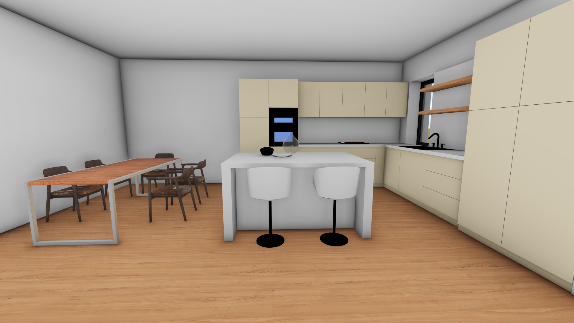 professional architectural photography of a luxury minimalist kitchen light oak wood cabinetry with vertical grain seamless handleless design floor to ceiling cabinets large kitchen island with a white marble waterfall countertop and a built in sink stainless steel integrated double oven and fridge warm beige walls light wooden flooring minimalist black track lighting and a thin linear pendant light over the island soft natural daylight high end interior design photorealistic 8k cinematic lighting featuring a long rectangular solid light oak wood dining table with sleek modern design paired with six to eight light beige fabric upholstered dining chairs with slender black metal legs echoing the minimalist aesthetic above the dining table a minimalist black linear pendant light or a series of small recessed ceiling spotlights walls painted in a warm beige tone light wooden flooring a large abstract piece of art in earthy tones on one wall