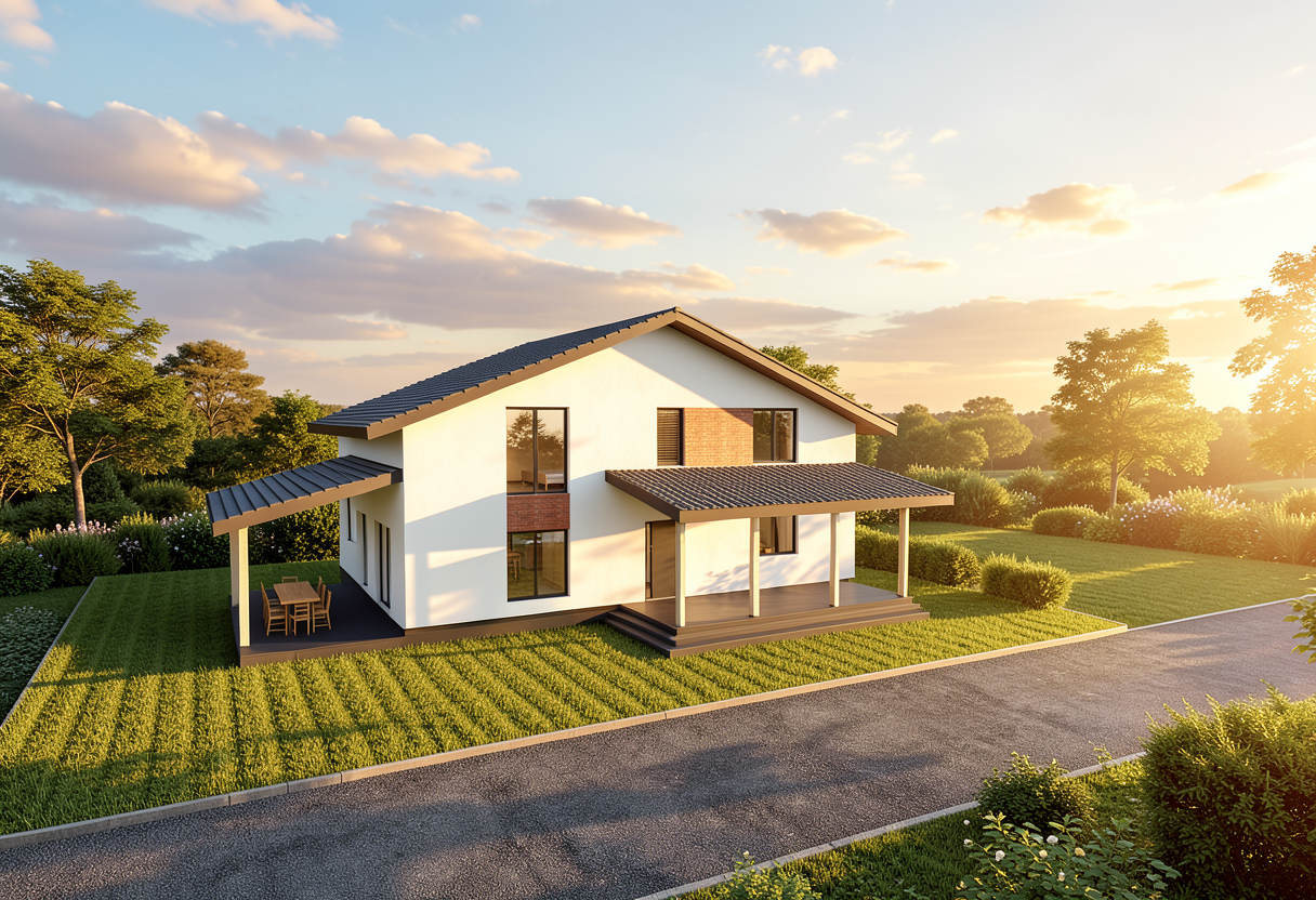 create an exact copy of this image with the following amendments only roof of smallest building is red tin walls of smallest building are red sandstone