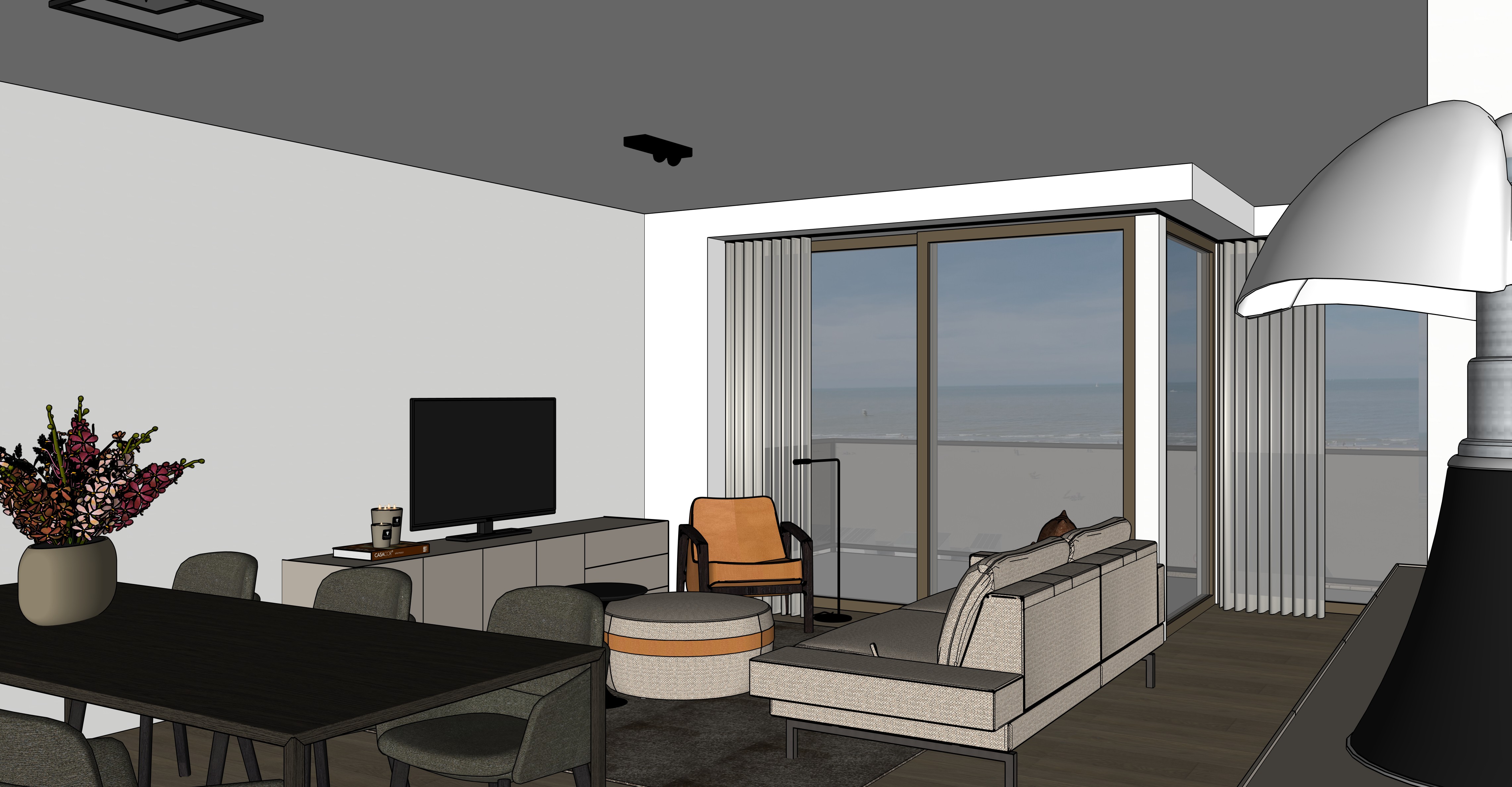 realistic interior shot with more sunny natural daylight lamps are shining sea and beach view