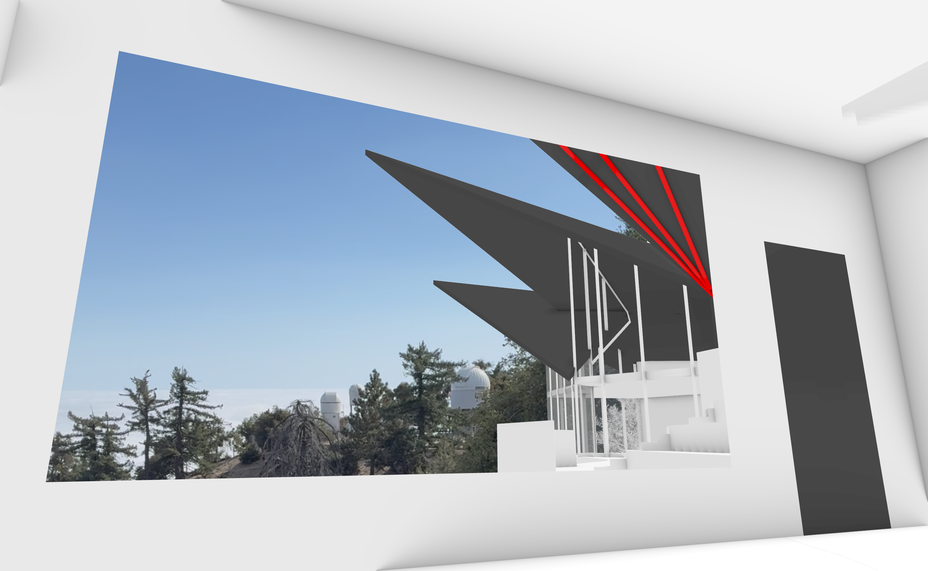 this is an interior shot of a building through a window give the room a soft wood texture and a door render this image with soft colors make the over hang roof a black standing seam roof make the red in this photo black like the roof