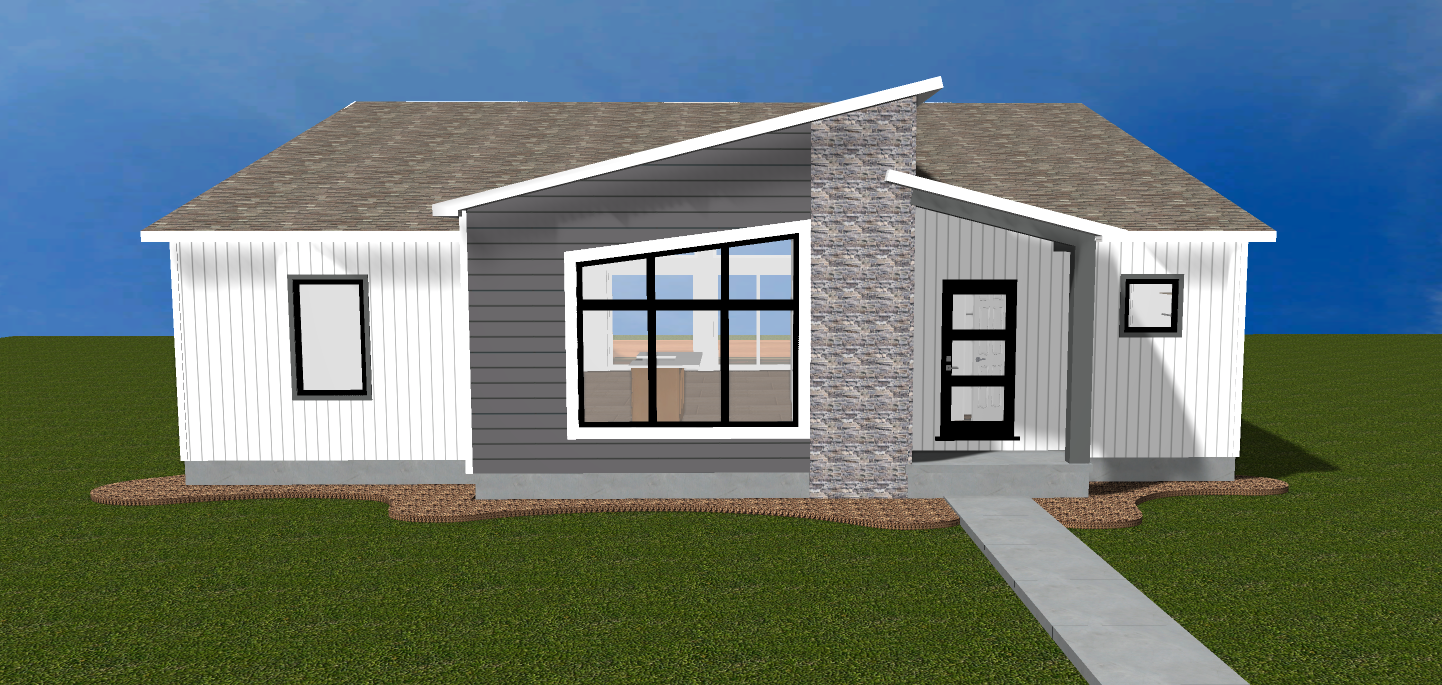 make as photorealistic as possible while keeping textures the same as selection professional landscaping in a lightly wooded scene with good lighting match materials to plan and remove any text dark grey siding black trim windows post and trim the area above the front door is open to the house
