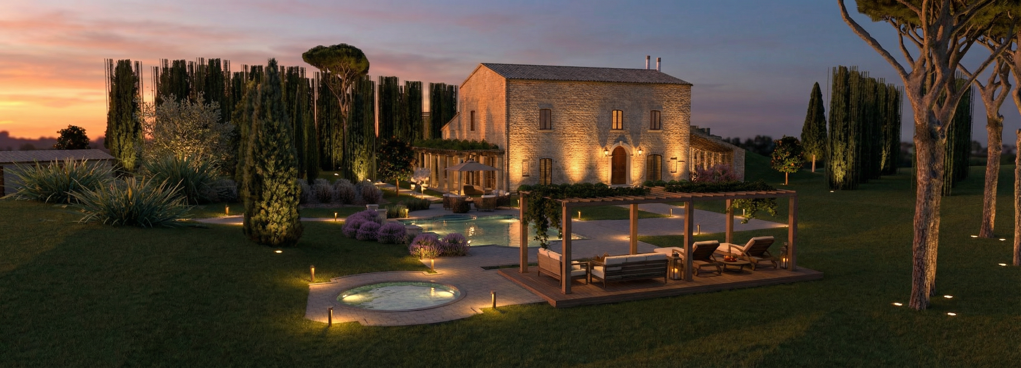 add light inside houses in the bacground with the ocean in the horizon