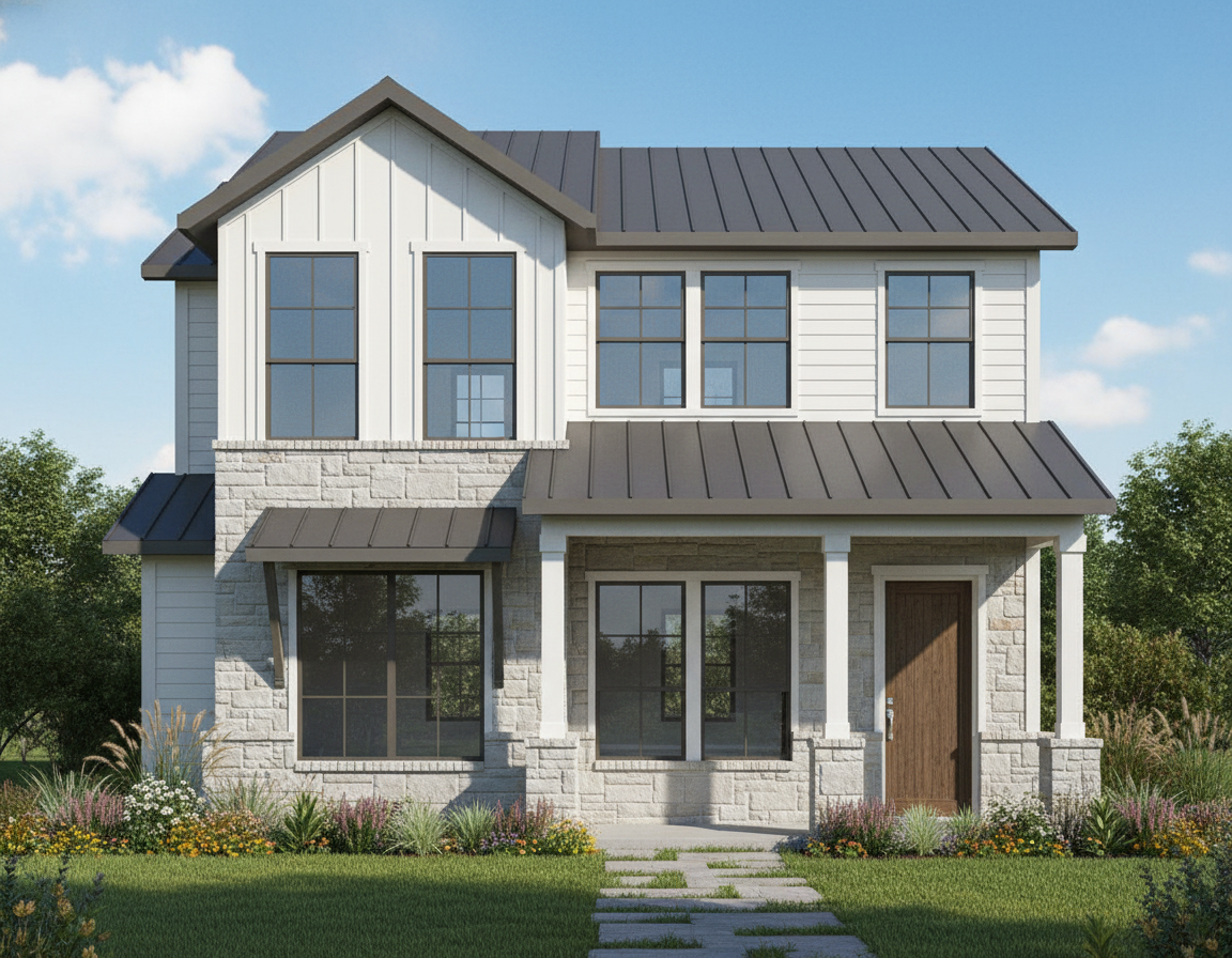 barndominium exterior shot exterior modern farmhouse with black roof black windows black board and batten siding brown wood timbers dark brown horizontal siding light colored stone white stucco architecture