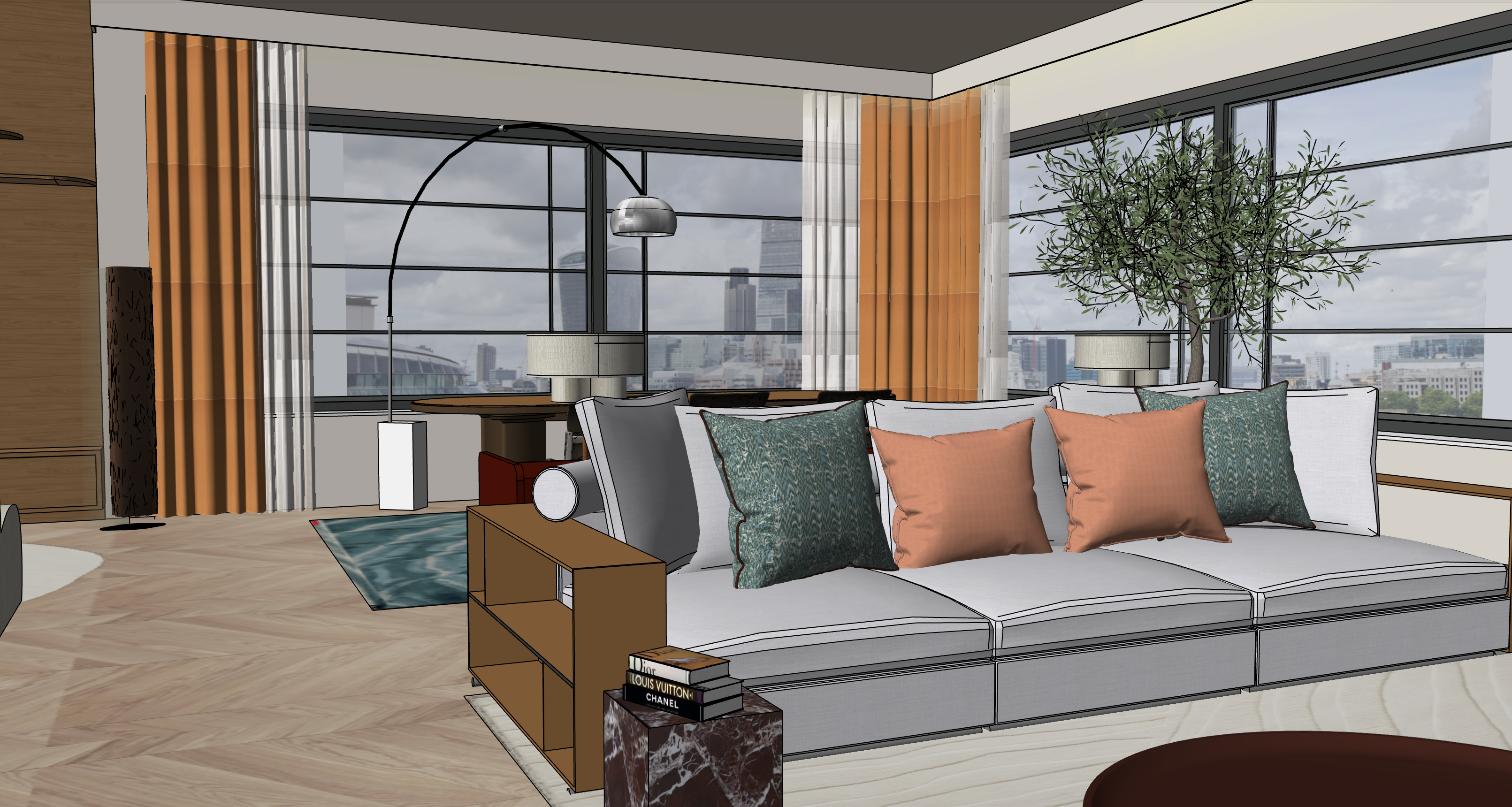 render a modern stylish living room with large windows overlooking a cityscape under a cloudy sky use natural wood textures for the floor and furniture and incorporate a sleek white and gray color scheme for the sofa accent the sofa with plush teal and soft peach pillows adorn the room with long orange and sheer white curtains for an elegant touch add a large potted plant with vibrant green foliage near the window and ensure warm ambient lighting for a cozy atmosphere capture a sense of contemporary elegance and urban sophistication