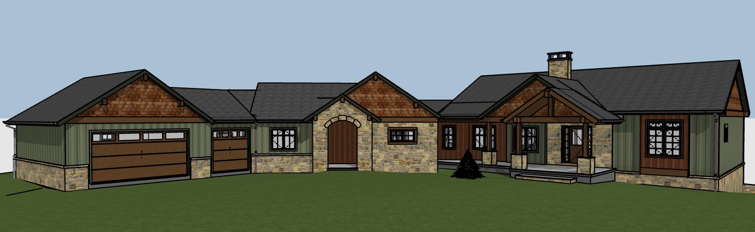 make photo realistic add driveway front walk landscaping with river rock and low mountains in background