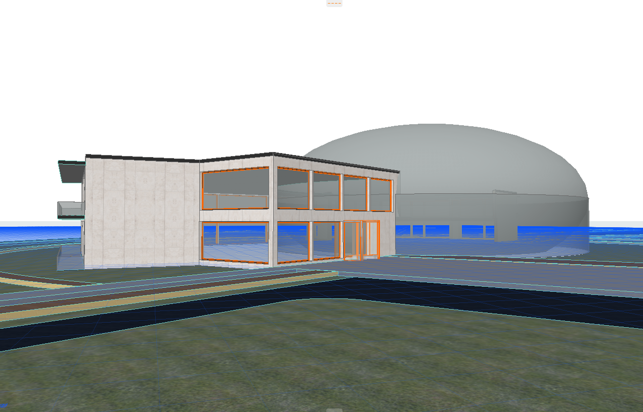 modernist exterior shot the dome is glass material and inside is botanical garden architecture