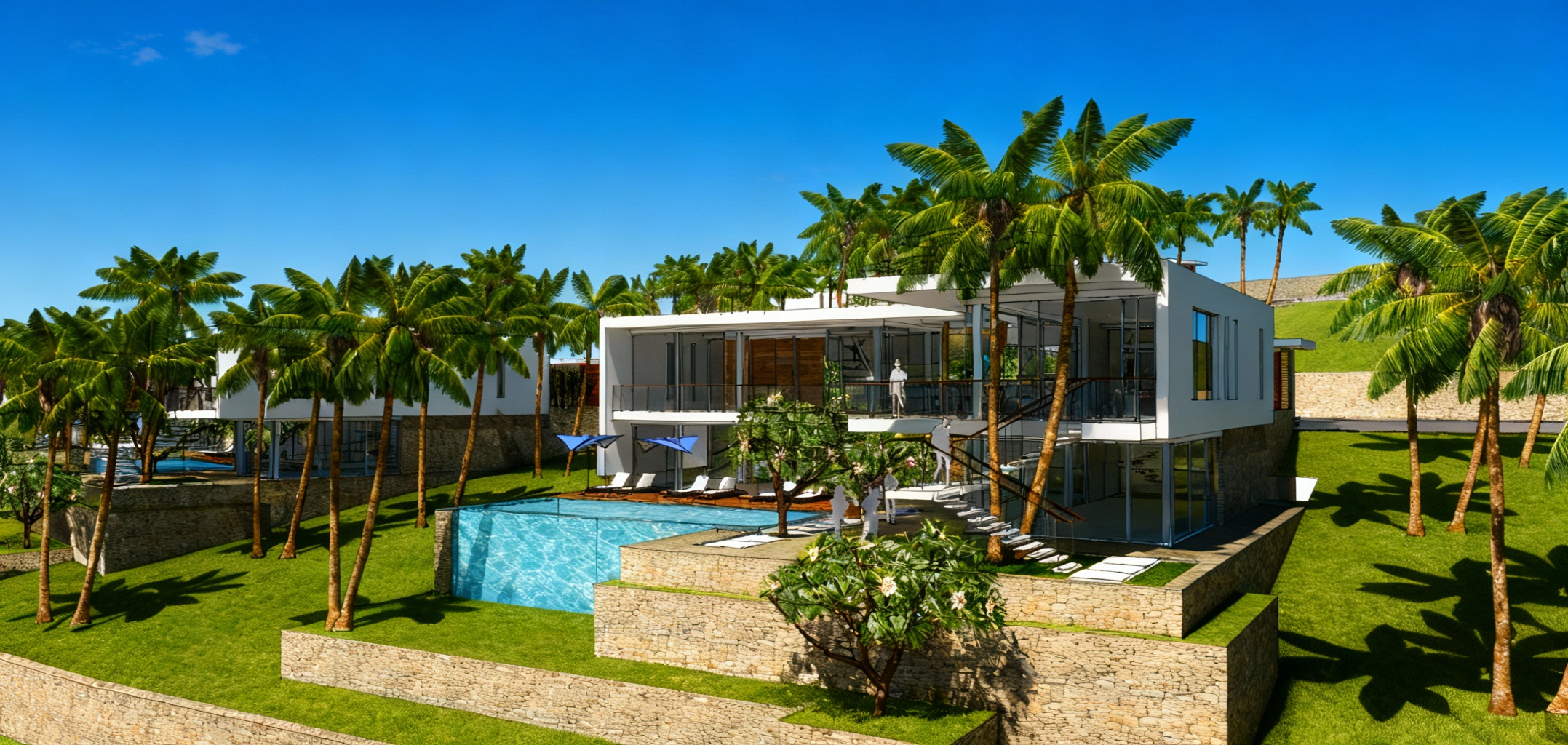 late evening view with lighting inside the villas add light on the waterfall at the infinity edge of the pool add light inside the pool water add tropical plants flowers and trees to the landscape add some fog effect in the distance add a few people inside the house and around the pool in resort attire