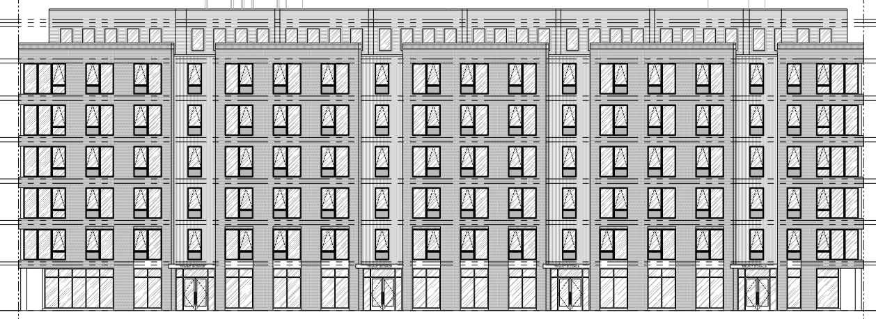 create a photorealistic rendering of the elevation brick should be red brick window frames should be black vertical lines should be charcoal colored wood siding first floor windows should have commercial or retail uses on the interior
