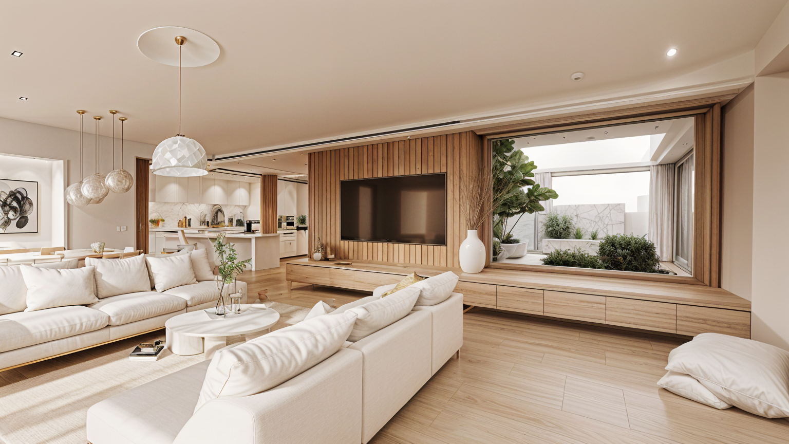 render three modern buildings on a green landscape with a clear blue sky use a crisp white for the building exteriors and deep black for the windows and railings accentuate the lush green grass and foliage ensure the pathways are a natural earth tone capture the scene in warm daylight casting soft shadows for a serene and harmonious atmosphere architecture