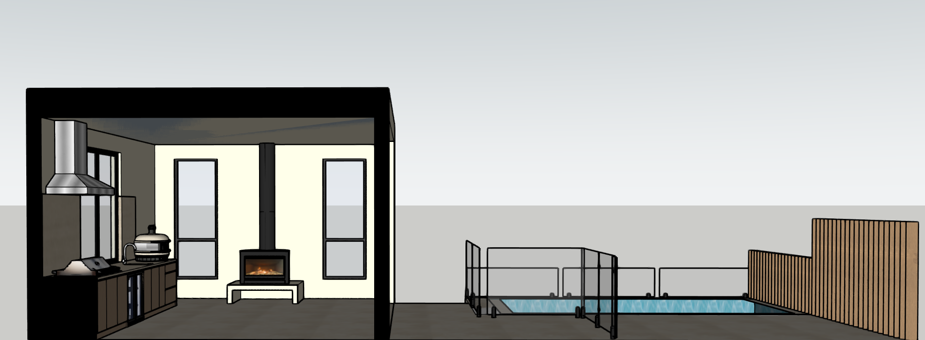 add contemporary landscaping to background backyard add contemporary lounge furniture near fireplace area do not extend room