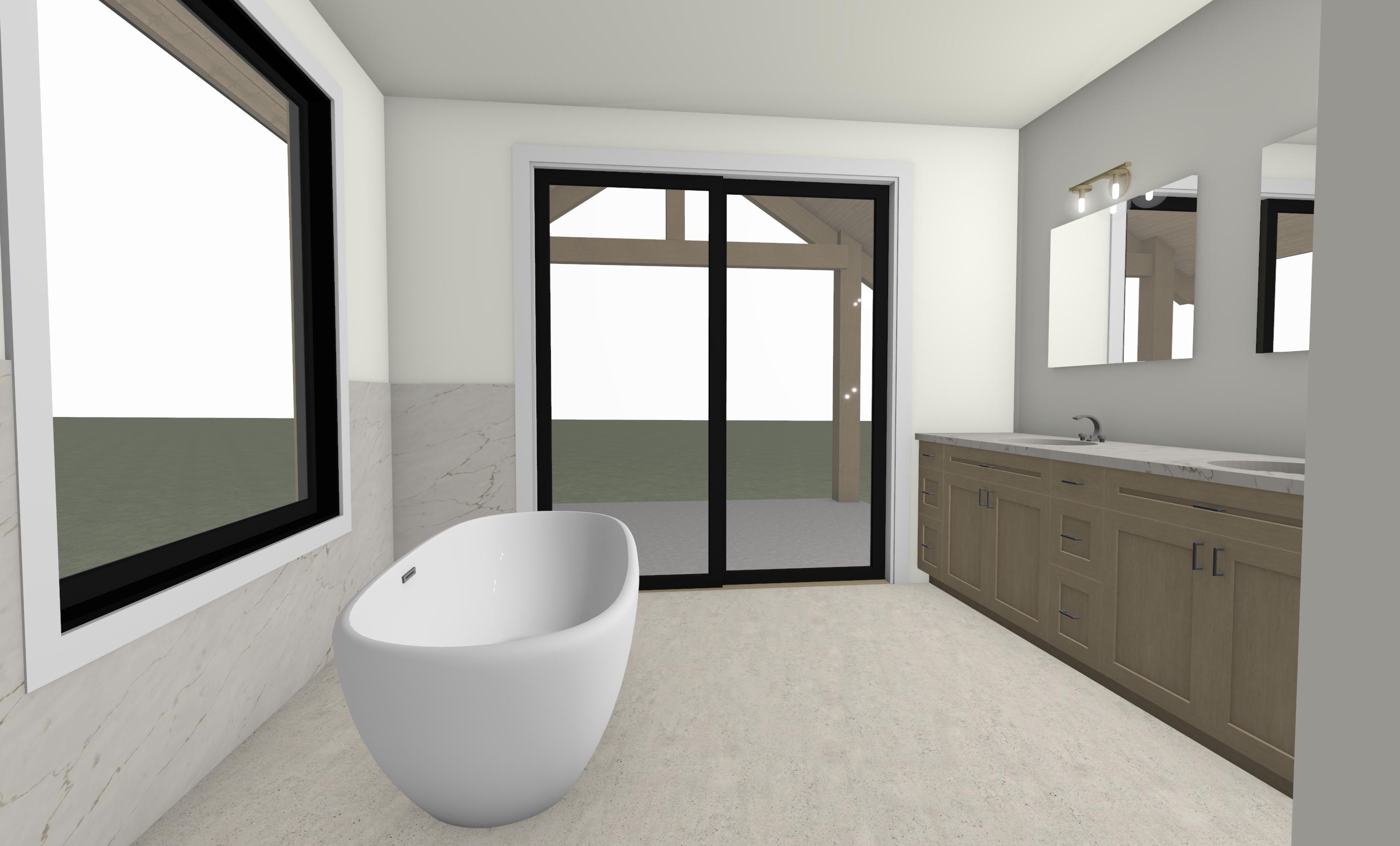 highest priority it s important to keep the sizes of everything the same change textures and materials but keep the sizes of everything the same its important to keep to scale the person in the photo is 5 6 for scale use her for scale and remove her from rendering do not change size of windows or doors do not add doors or windows do not change or add fixtures keep cabinets fridges ovens and all fixtures in the same place and the same size bath room materials warm modern luxury bathroom with light gray marble or quartzite subtle veining polished finish light natural wood cabinetry mixed with painted off white cabinets flat panel doors minimal hardware soft warm lighting pendant over tub brushed brass accents tall brass faucet neutral color palette creamy whites warm taupes light wood tones wide plank oak flooring clean and minimal styling high end residential design soft ambient glow architectural visualization ultra realistic 8k detail back ground in pine trees and montana vegetation