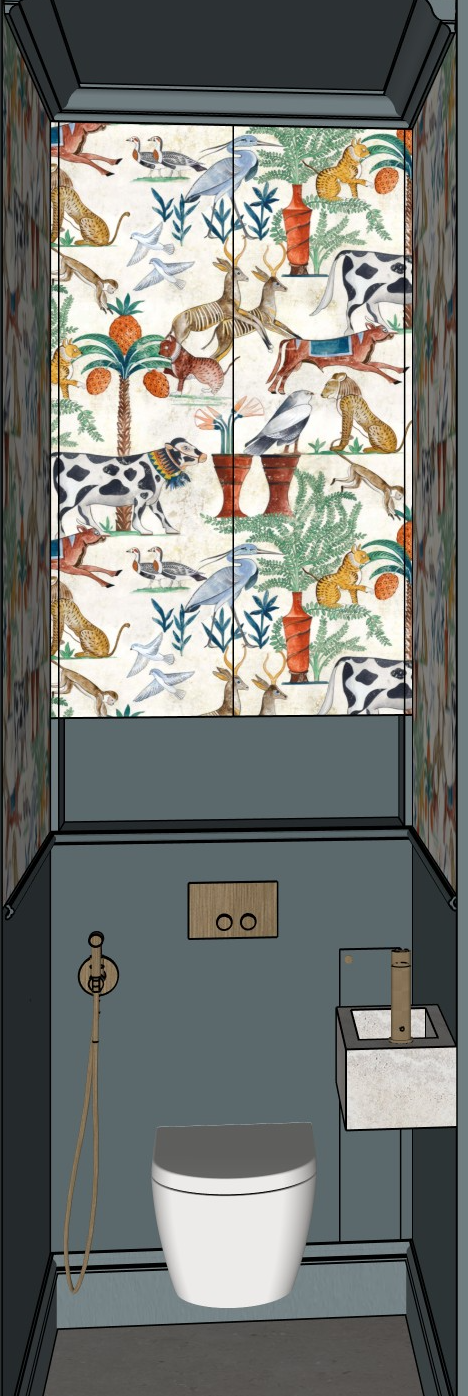the blue color on the lower part of the walls is farrow and ball barrow blue https www farrow ball com fr peinture barrow blue the fittings are in brushed brass the floor is marazzi mystone tivoli beige it is located in a parisian building the wallpaper is the following from pierre frey https www pierrefrey com fr papiers peints fp482001 sur le nil