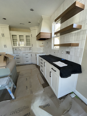 do not change the cabinets in any way preserve the exact cabinet colors materials finishes dimensions door and drawer styles hardware spacing alignment and all geometry exactly as shown do not alter the countertop shape backsplash appliances flooring lighting fixtures or wall structure only remove the construction materials clutter and mess from the scene clean the room and make it look finished and staged add a few simple tasteful home accessories appropriate for the style of the space but do not add or remove any furniture windows or architectural elements maintain the original lighting direction and realism enhance clarity and polish the photo while keeping the cabinetry and room design completely unchanged do not alter the lighting to keep the cabinet colors as they are in the image add a slide in range below the hood