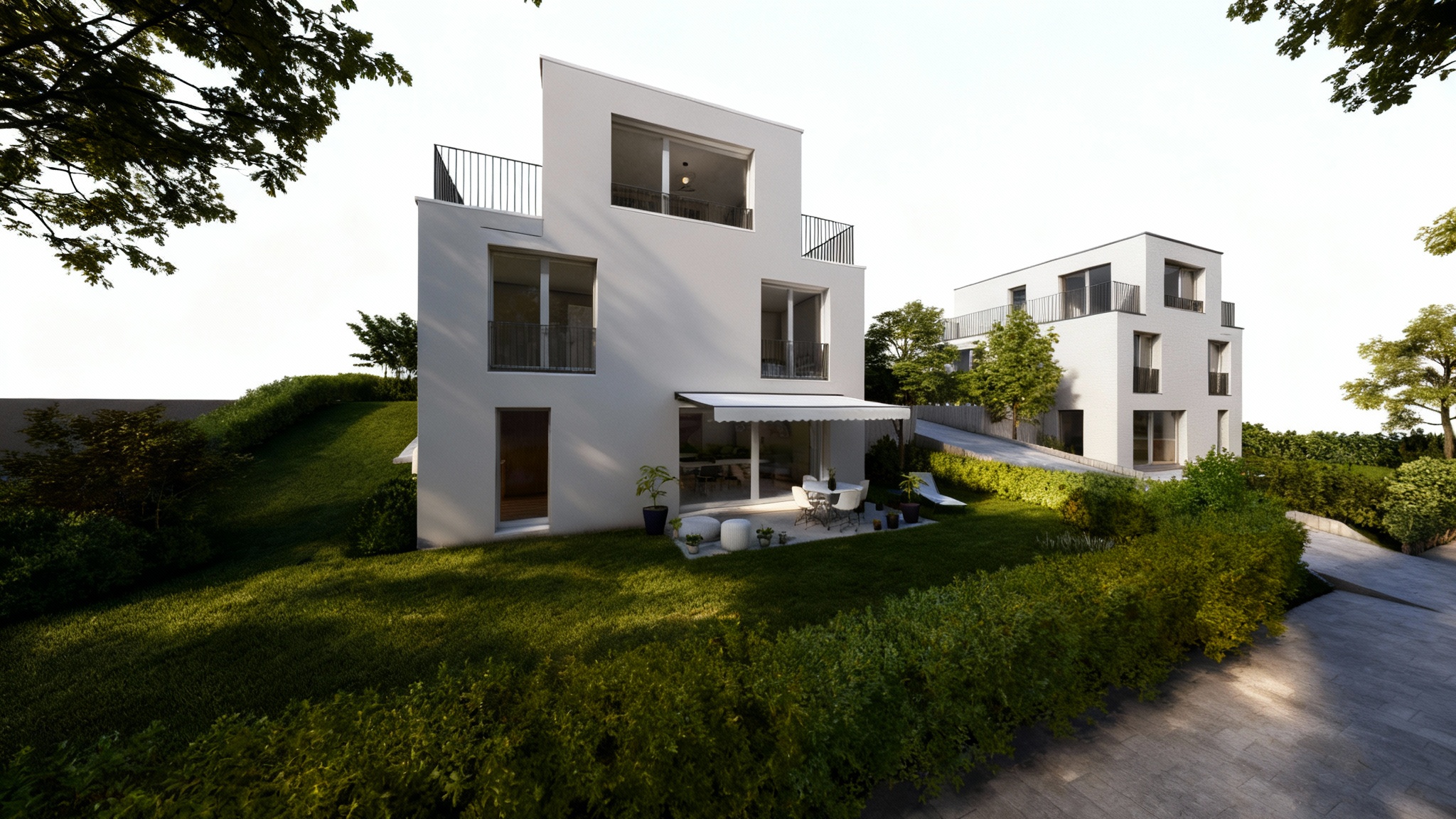 render image keeping all colors and finishes and architecture the same make photo realistic make view out of windows a parking lot and field