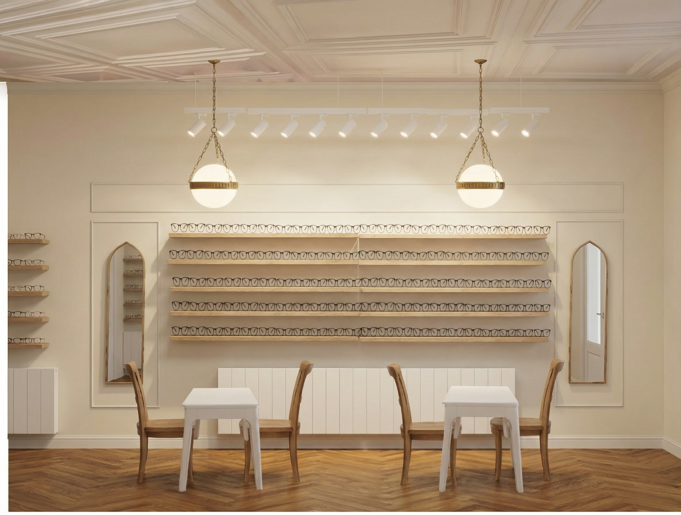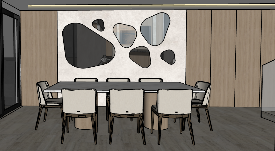 the organic shapes on the wall are mirrors light oak wood the floor is a travertine mate marble