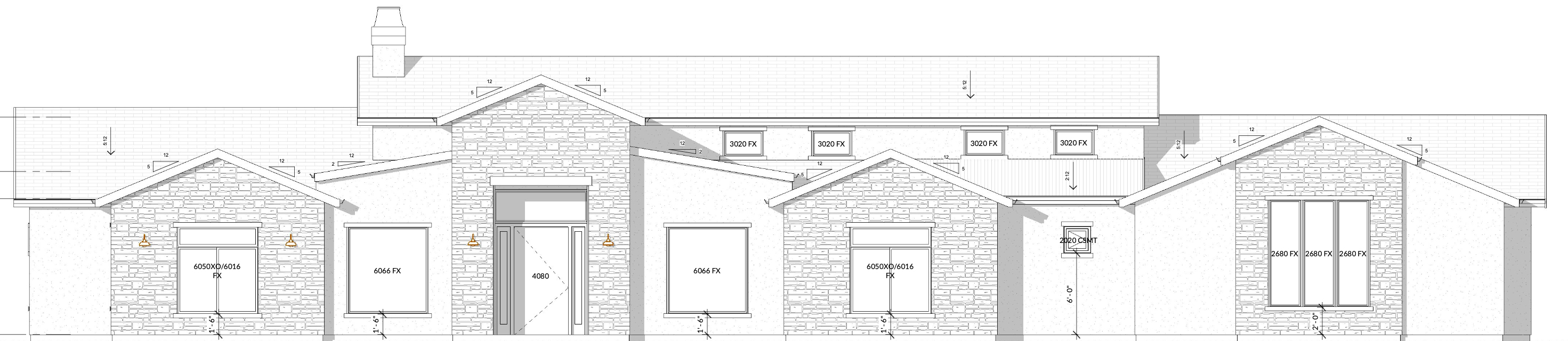 house with black roof white stucco and rock walls and trees on both sides of the house