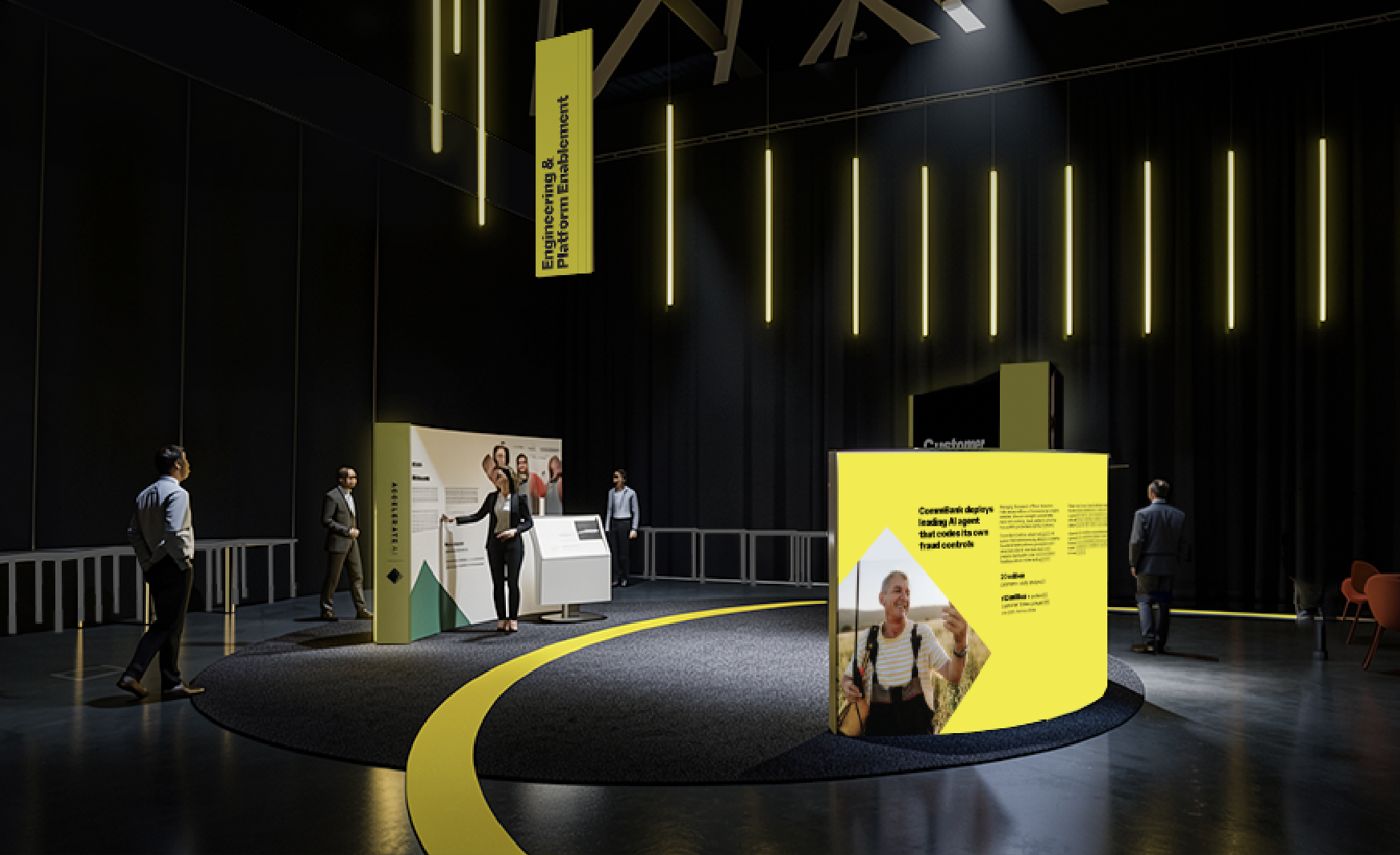 create a sophisticated exhibition space set in a dimly lit environment the atmosphere should be modern and sleek utilizing a dominant black backdrop to accentuate elements include a circular carpet on the floor in a dark grey tone with bright yellow curved line on the floor that guide the viewer s eye the ceiling is illuminated by glowing vertical yellow neon lights a subtle spotlight enhances details creating a balanced and immersive atmosphere