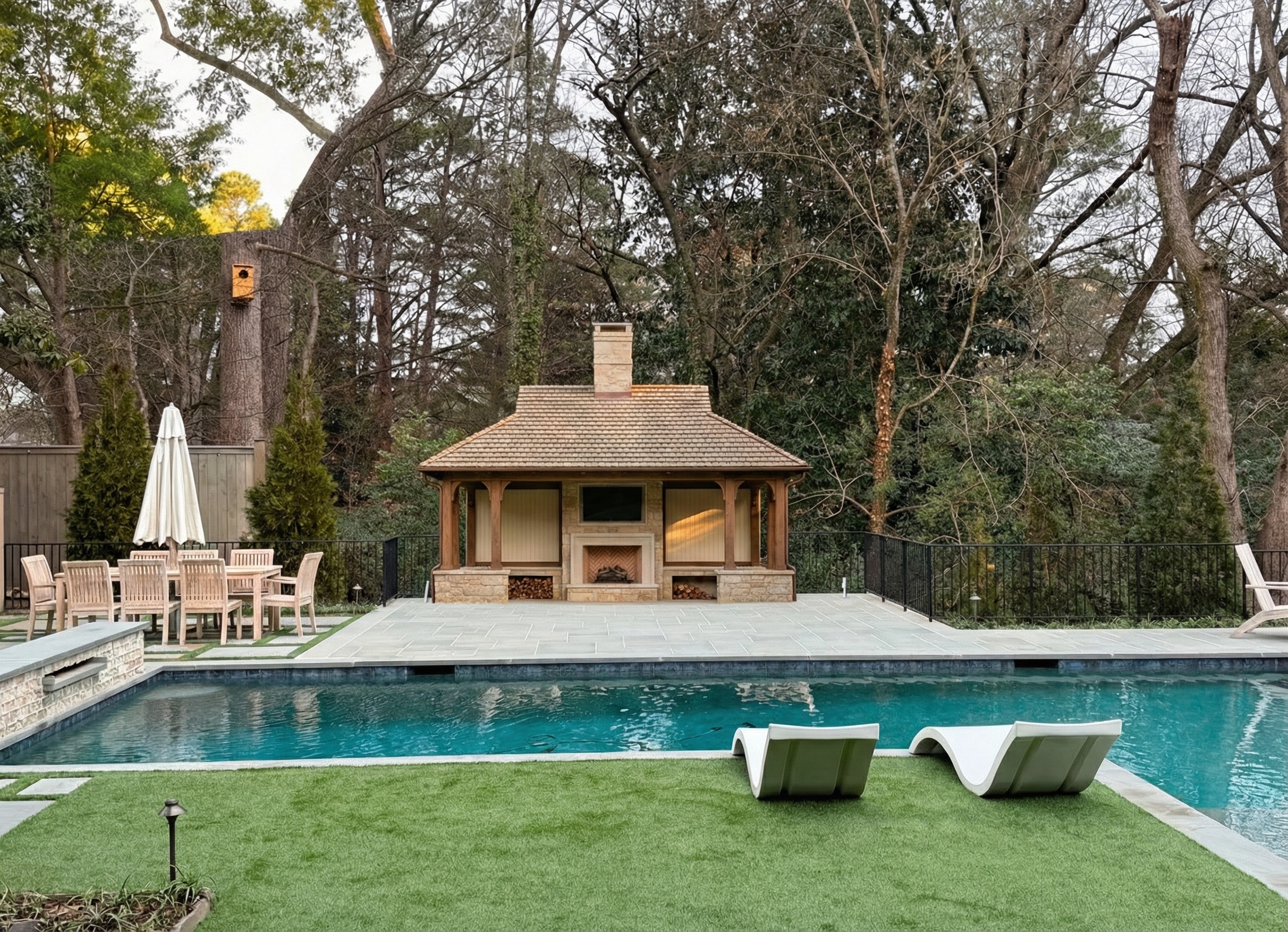 use the current pool and cabana image as the base scene increase the scale of the cabana significantly the cabana must extend forward toward the pool so the front edge of the structure is approximately 8 feet from the pool coping the front face of the cabana should align roughly with the row of dining chairs closest to the pool increase the depth substantially so it reads as a true outdoor living room not a shallow pavilion also increase the width so the cabana spans the full width of the patio area between the left dining area and the right fence line it should visually anchor the entire patio width maintain the same architectural style roof material chimney stone base wood columns and fireplace design but scale all elements proportionally larger keep roof pitch appropriate and realistic maintain proper structural proportions for beams and posts preserve the pool decking fencing trees and lighting exactly as shown this is a massing and proportion adjustment only not a redesign high resolution photorealistic rendering with accurate shadowing and ground contact increase front to back dimension by at least 40 60 compared to the current rendering