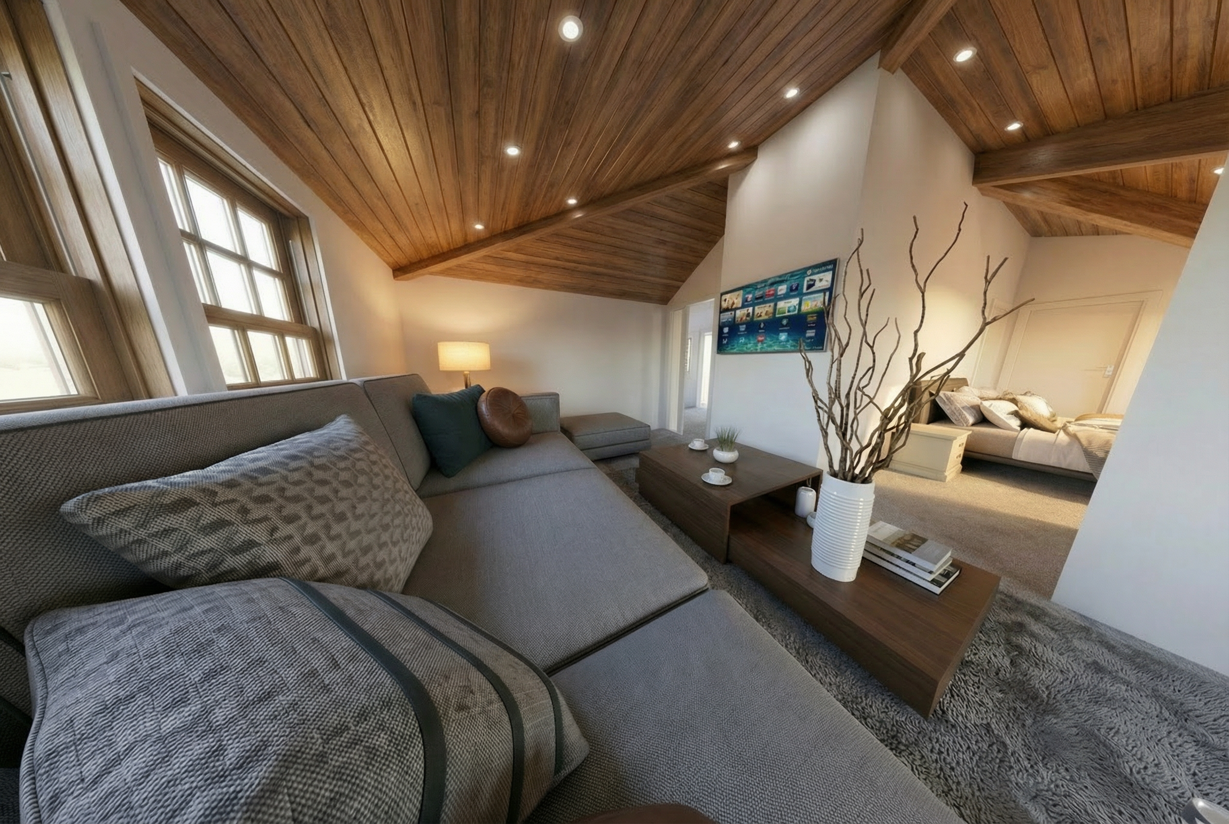 aerial shot make nice spring image from above add some trees no flowers all cars should be white path and terrace made of wood make shadows like at noon going north the roof is gabled architecture