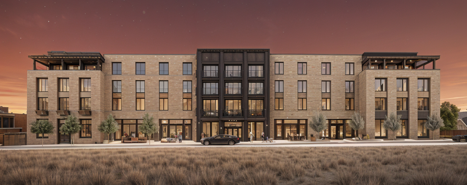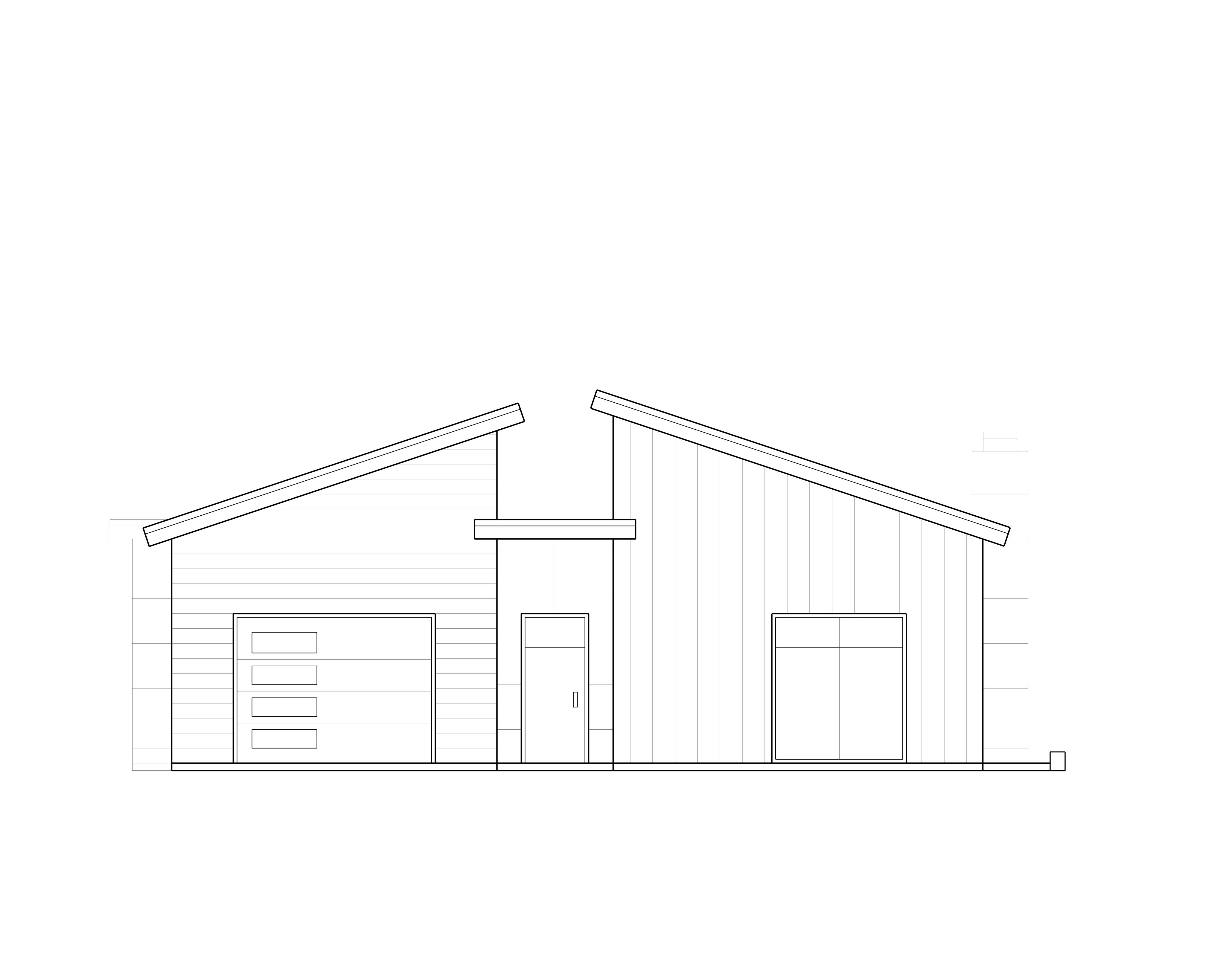 modernist exterior shot a modern architectural design of a house with two asymmetrical sloped roofs the exterior walls are a sleek combination of dark charcoal gray and warm natural wood tones complemented by large floor to ceiling windows that reflect the surrounding environment the front entrance door is a bold matte black with minimalist design while slim black frames highlight the windows the garage door is matte black modern the atmosphere is serene and contemporary situated in a lush green landscape with a clear blue sky sunlight casts soft shadows enhancing the modern aesthetic architecture