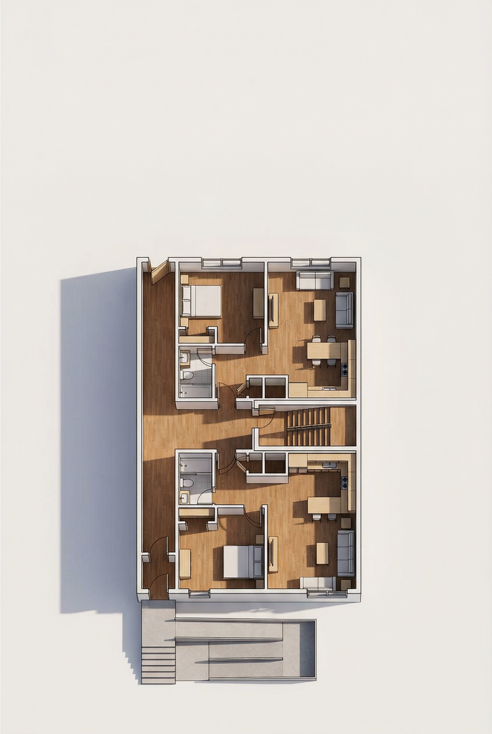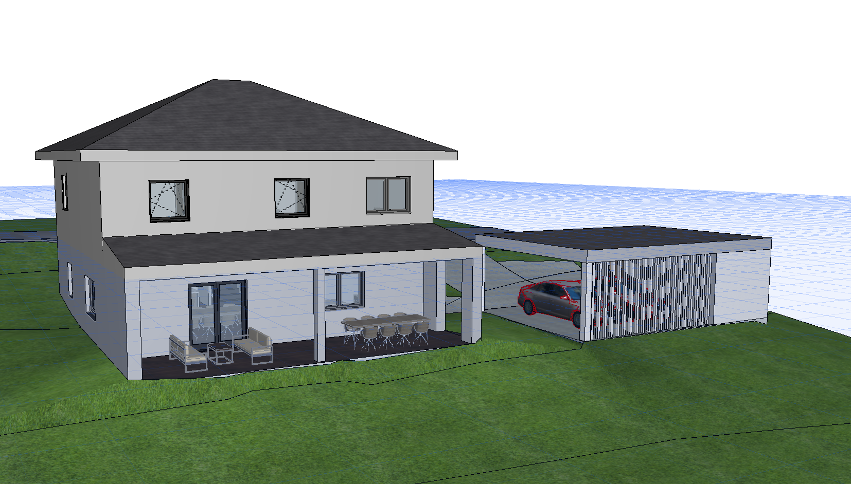 photorealistic render of a modern style house with clean architectural lines and a minimalist design the facade features warm brown toned smooth plaster combined with wooden cladding accents on selected sections of the exterior large floor to ceiling windows with anthracite colored window and door frames integrated hidden led lighting along the facade lines under the roof overhangs and around the entrance creating a subtle elegant glow a modern garage is attached to the house the house is surrounded by lush greenery including a manicured lawn ornamental shrubs and mature trees sunset golden hour lighting with warm tones soft cinematic shadows realistic reflections in the glass ultra detailed textures global illumination ray tracing high dynamic range lighting 4k resolution professional architectural visualization highly realistic materials eye level perspective 35mm lens cinematic composition depth of field no car
