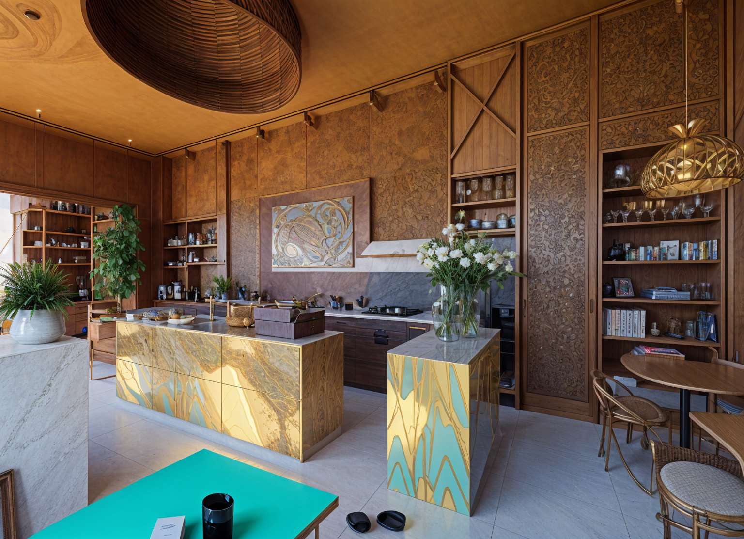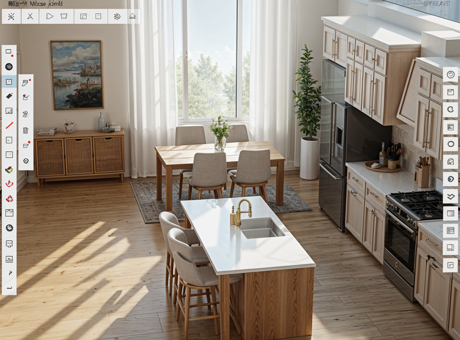 material and colors like on the picture light soft white look add a soft sunlight replace the floor soft oak flooring white beige tone island and table in a soft honey oak wood kitchencounter and island counter in a white marble with calacatta with gray veins picture replace in creamy tone ocean picture just like on the picture showing