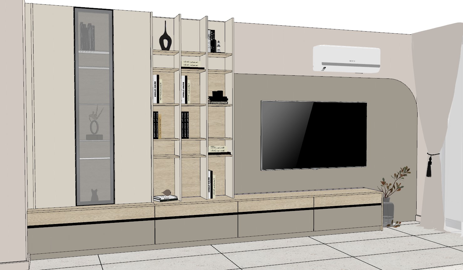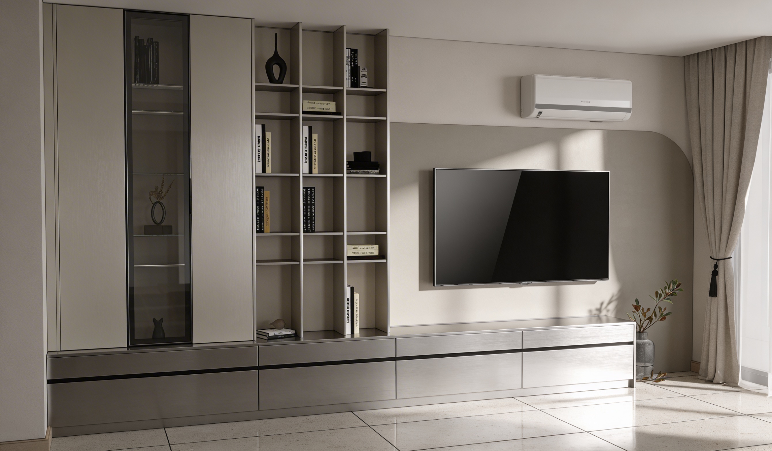 render an elegant living room scene featuring a modern entertainment unit the cabinets and shelves are designed with a light oak wood finish offering a subtle contrast with the sleek black accents of the tv frame and decorative items include a soft beige wall backdrop complemented by light gray tiles on the floor the atmosphere is calm and sophisticated enhanced by the soft ambient lighting add tasteful decor items such as minimalistic sculptures and neutral colored books to add depth and texture ensure a soothing and harmonious color palette that exudes modern elegance
