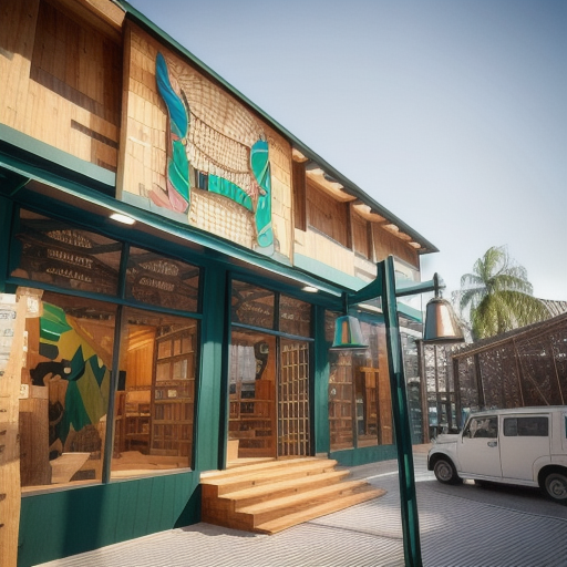 fishrman shop modern and contepmorary long wooden canopy africa trees people crowded architecture