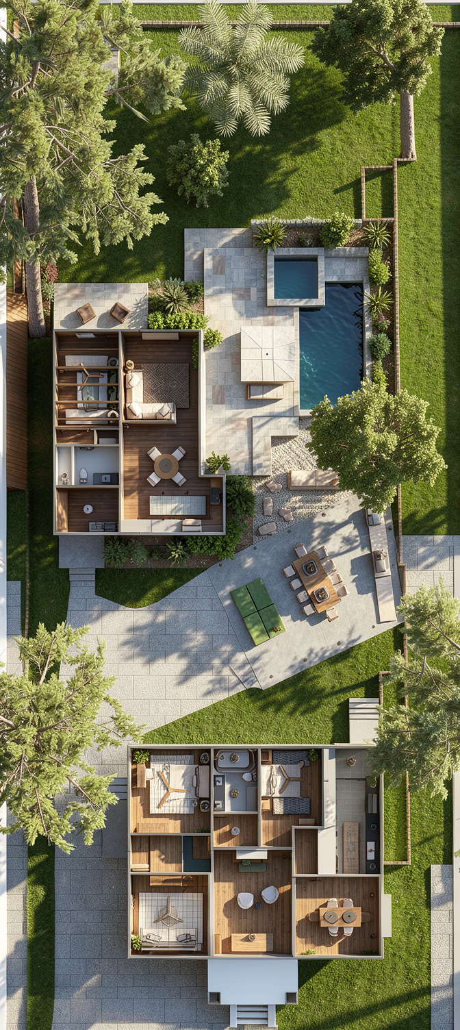 a modern architectural house by a serene canal the house features sleek angular design with cool gray brick texture large windows reflect soft sunlight the foreground has green landscaped grass and a wooden deck by the deep blue water the sky is expansive filled with fluffy white clouds and a soothing light blue backdrop the atmosphere is peaceful and contemporary with warm natural light enhancing the scene