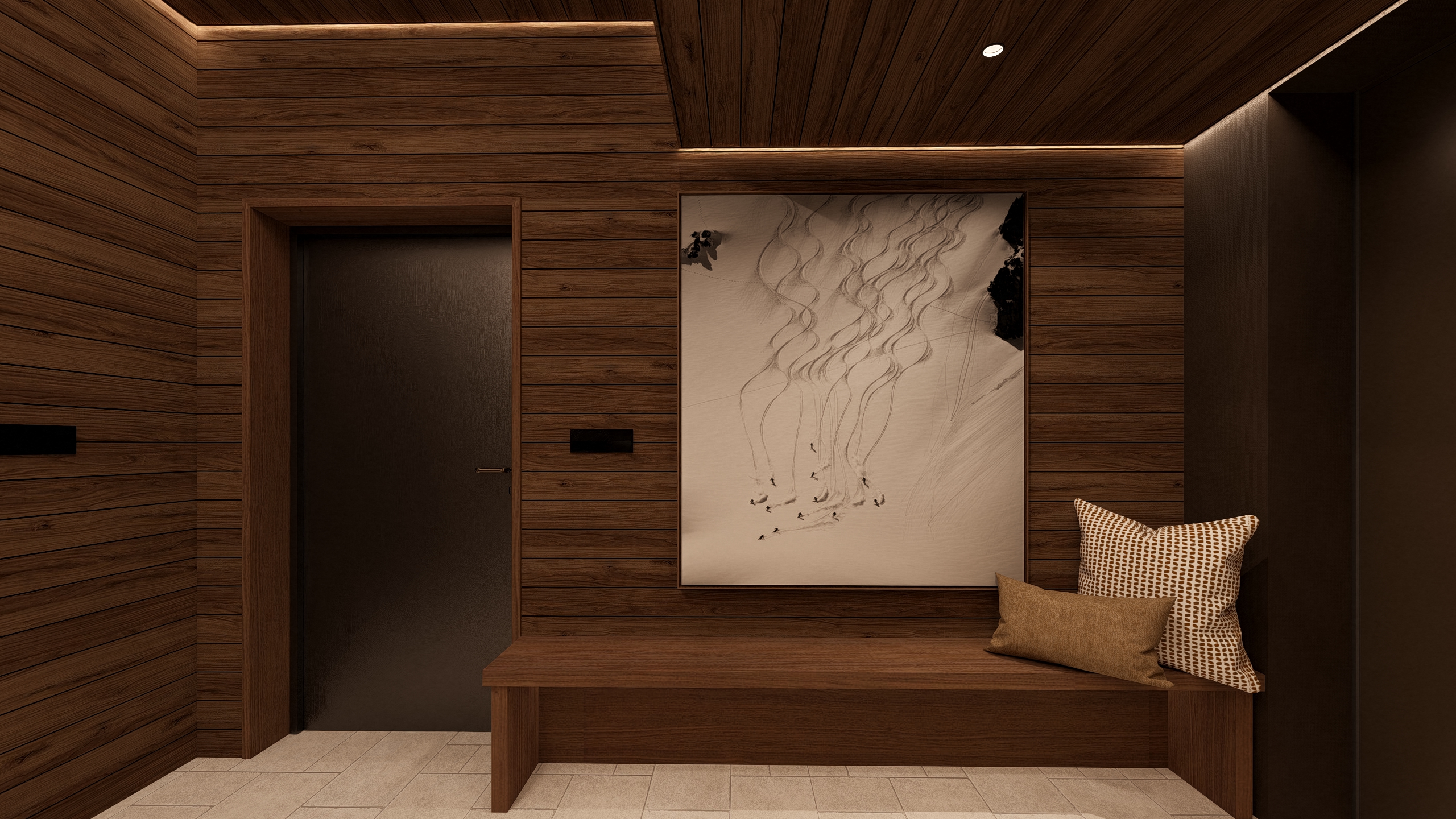 photorealistic architectural render of this exact wooden interior scene keep all elements unchanged dark wood walls and ceiling with preserved grain and texture black door abstract white swirling artwork on wall wooden bench ultra realistic beige pillow with soft textured linen cotton fabric subtle weave details natural folds and creases do not change anything else enhance realism of existing materials only with accurate warm ambient lighting from recessed lights soft highlights on wood surfaces subtle reflections matching light wood floor sheen natural shadows and depth add only on a small floor fragment directly in front of and partially under the front edge of the bench a realistic sheepskin shearling rug exactly like the reference elliptical oval shape about 1 2 meters long and 0 7 meters wide fragment natural sheep wool in warm beige and brown shades with gradient from light beige to dark brown long dense shaggy fleece with wavy texture and natural hair strands soft fluffy slightly ruffled edges lying flat integrated soft shadows and subtle light reflections matching the warm ambient lighting no distortion perfectly blended into the scene without covering the entire floor area high resolution 8k ultra detailed fur texture fabric realism enhanced material fidelity through precise shadows reflections and soft lighting as in professional product photo