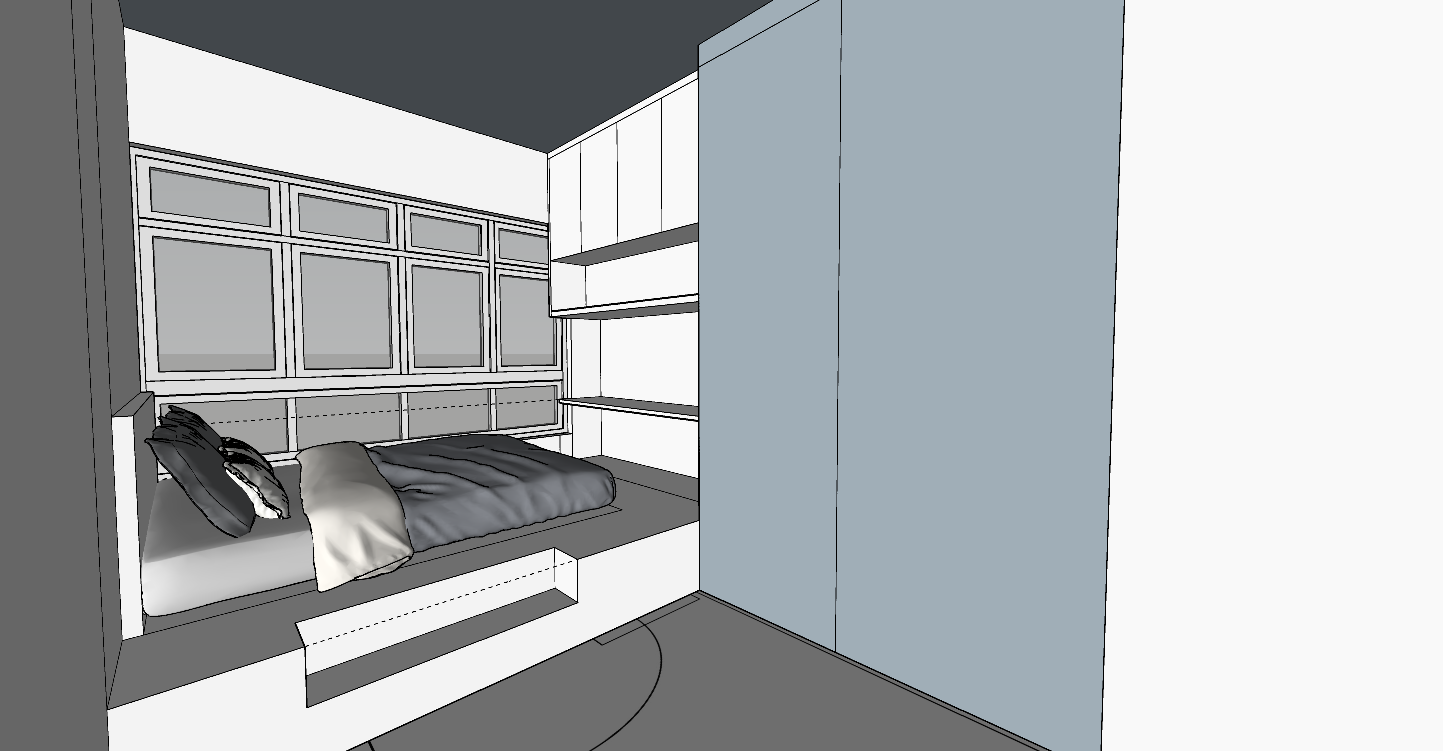 render this into a bedroom with grey wardrobe and platform bed and study ledge with shelvings on top add lighting too to make it relistic