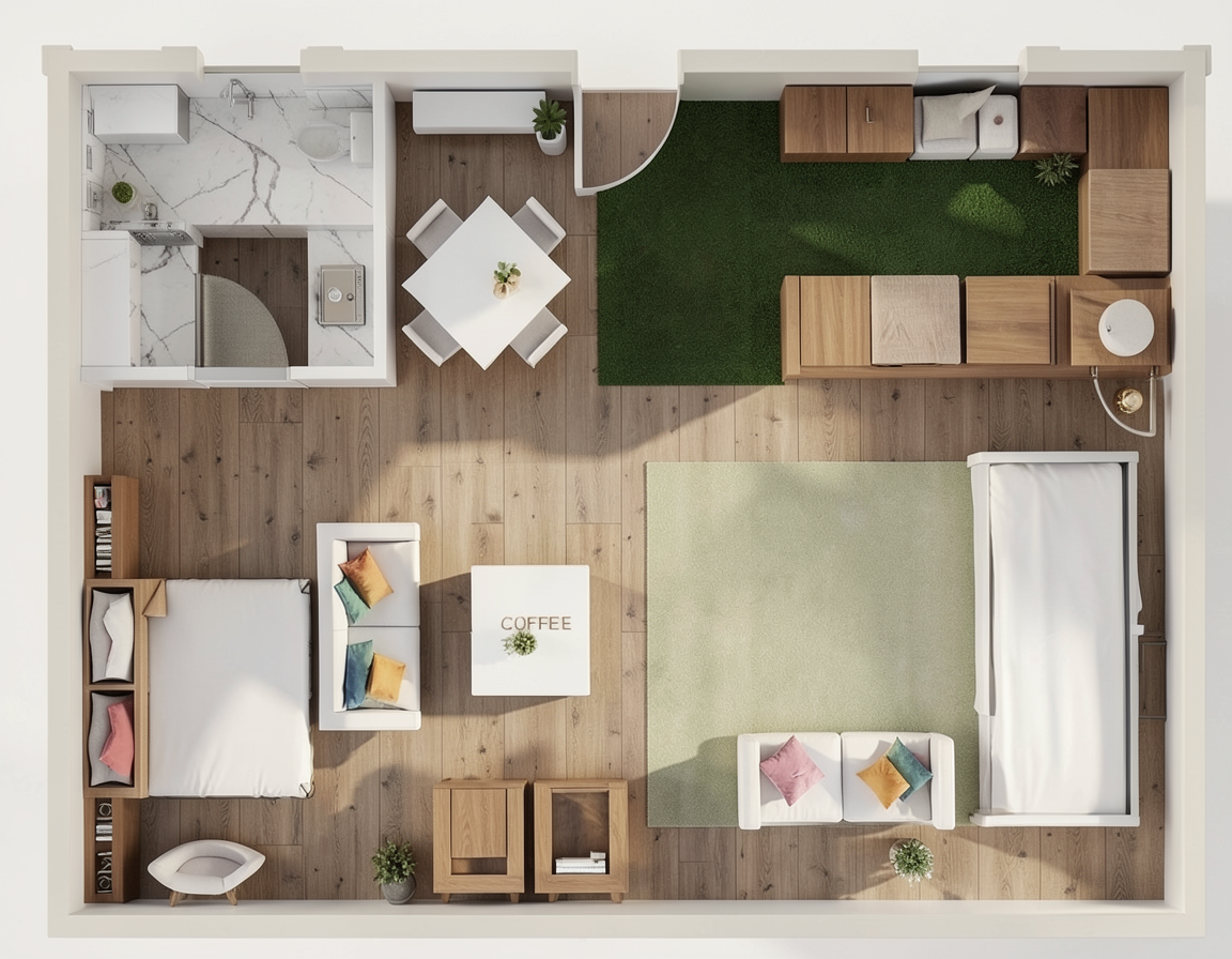 convert this floor plan into a realistic isometric 3d view of a full house show the space from an elevated angle with furniture walls and details visible do not modify my floorplan warm cozy brown and black interiors use the same furniture as shows on the plan do not change the orientation of the floorplan