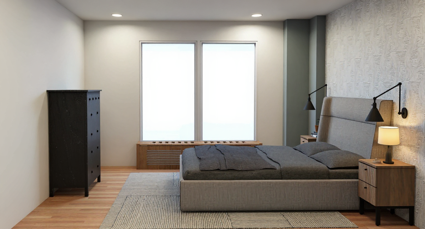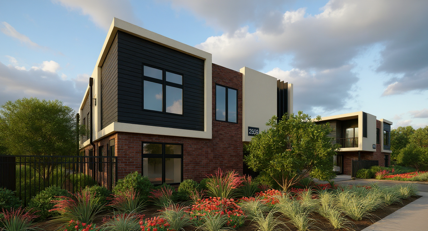 white warm stucco exterior black horizontal metal siding brick veneer black trim around windows black metal slats a partly cloudy midafternoon sky following a light rain with a mix of cumulus clouds concrete sidewalk photorealistic render