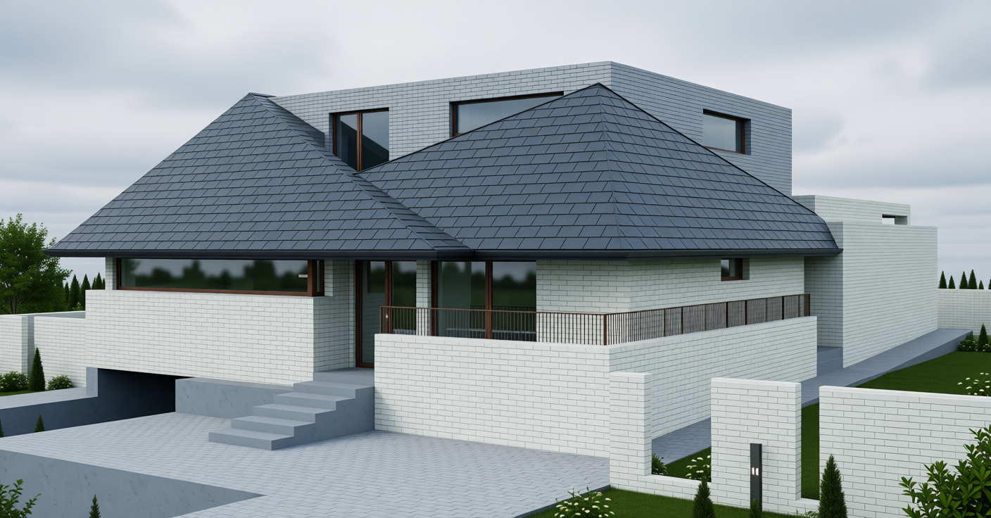 create high resolution photo with plush trees and bushes with vibrant sky create a country french country shutters with used texas brick shown a french country blend