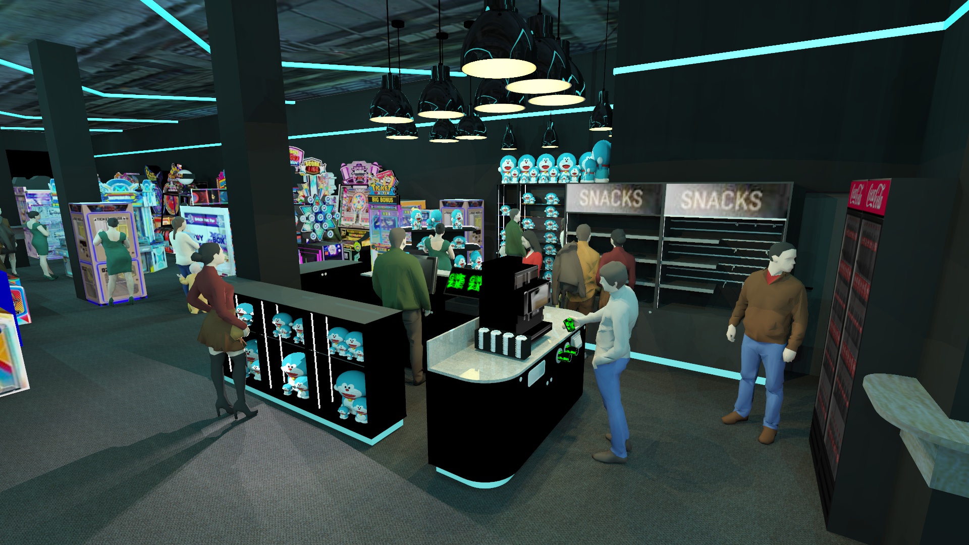 an arcade and gaming hall the machines glow brightly black walls and a black ceiling the floor covered in dark gray carpet turquoise light lines on the ceiling and turquoise lighting under the furniture create a photorealistic effect