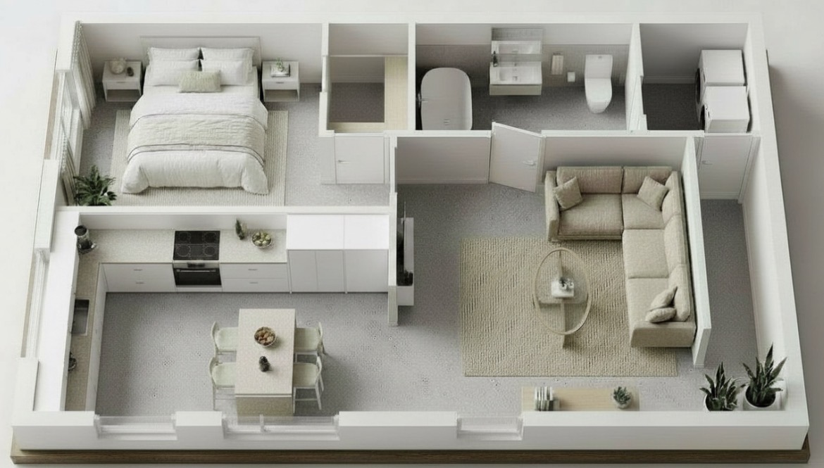 convert this floor plan into a realistic isometric 3d view of a full house show the space from an elevated angle with furniture walls and details visible remove the plant use the same furniture as shows on the plan do not change the orientation of the floorplan