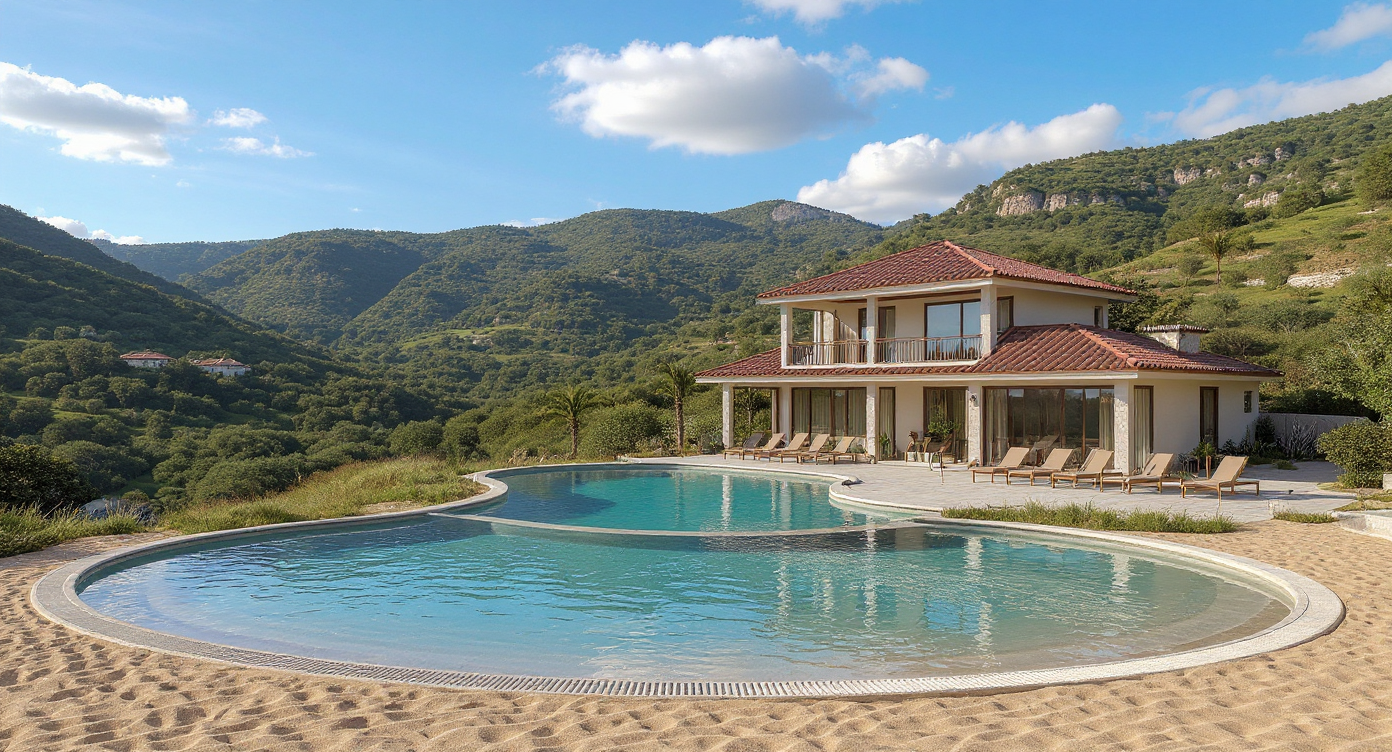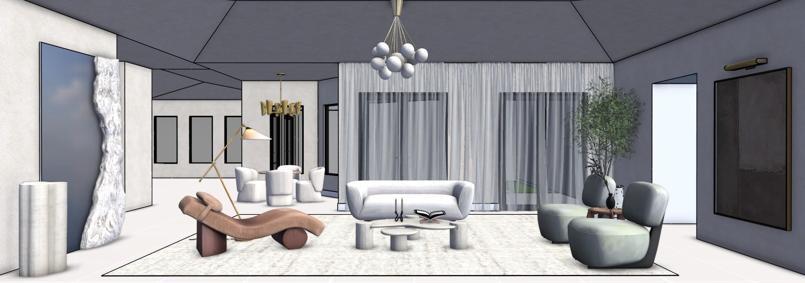 edit the original photo by enhancing and activating all existing light sources in the scene increase the illumination of the light above the artwork the ceiling light and the wall sconces making sure all lights are visibly turned on the lighting should feel natural and modern with a soft realistic glow warm but neutral not overly yellow improve overall brightness and light balance without overexposing the image preserving realistic shadows and depth the final result should look like a professionally lit contemporary interior with clean natural ambient lighting add a white vase to the pedestal on the left keep the plant and the floor is a white glossy and big tiles replace the color of the two chairs for an ivory white