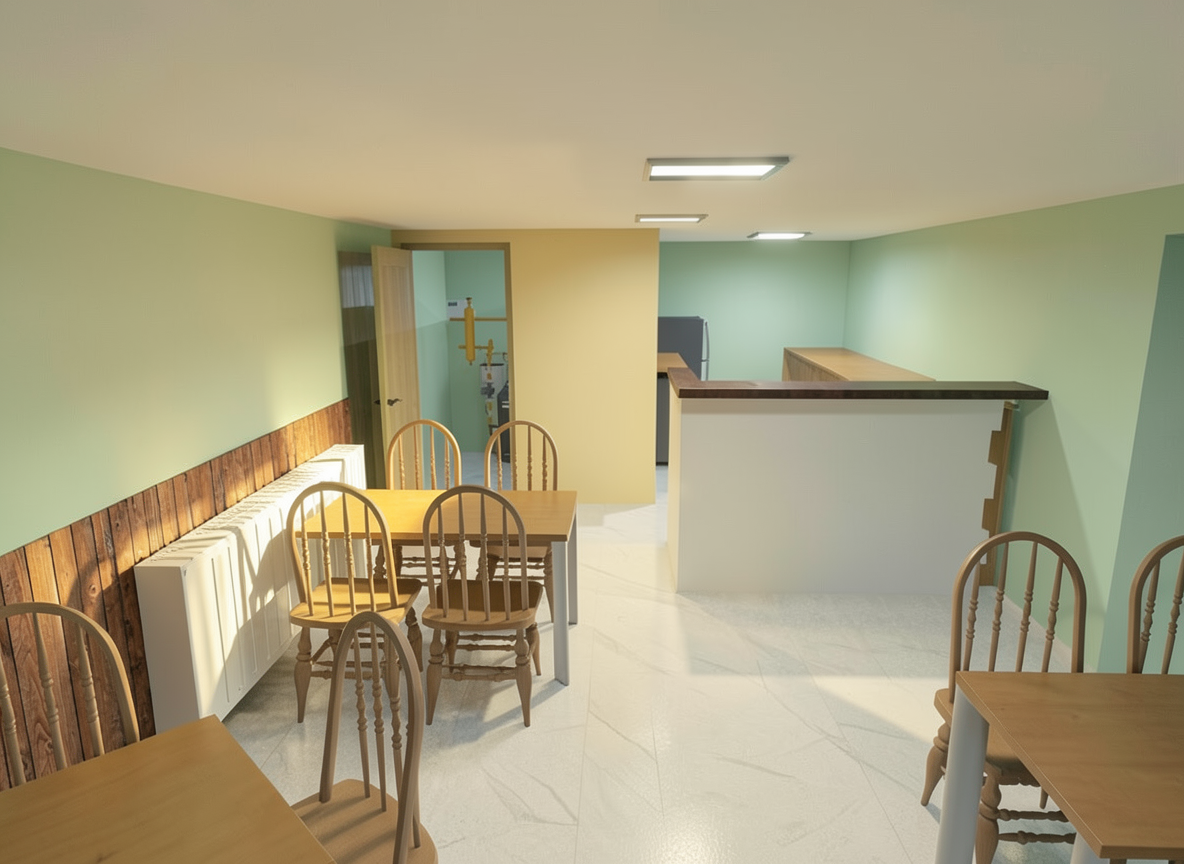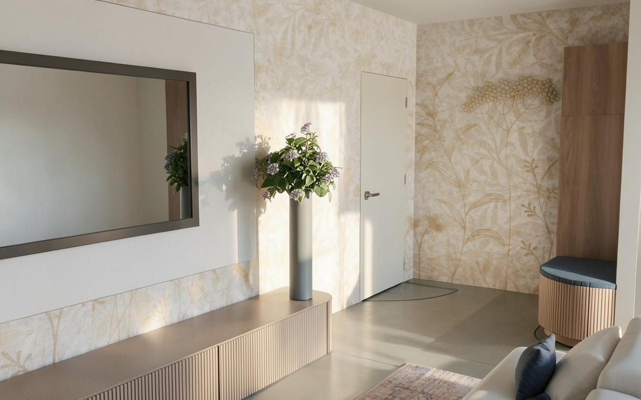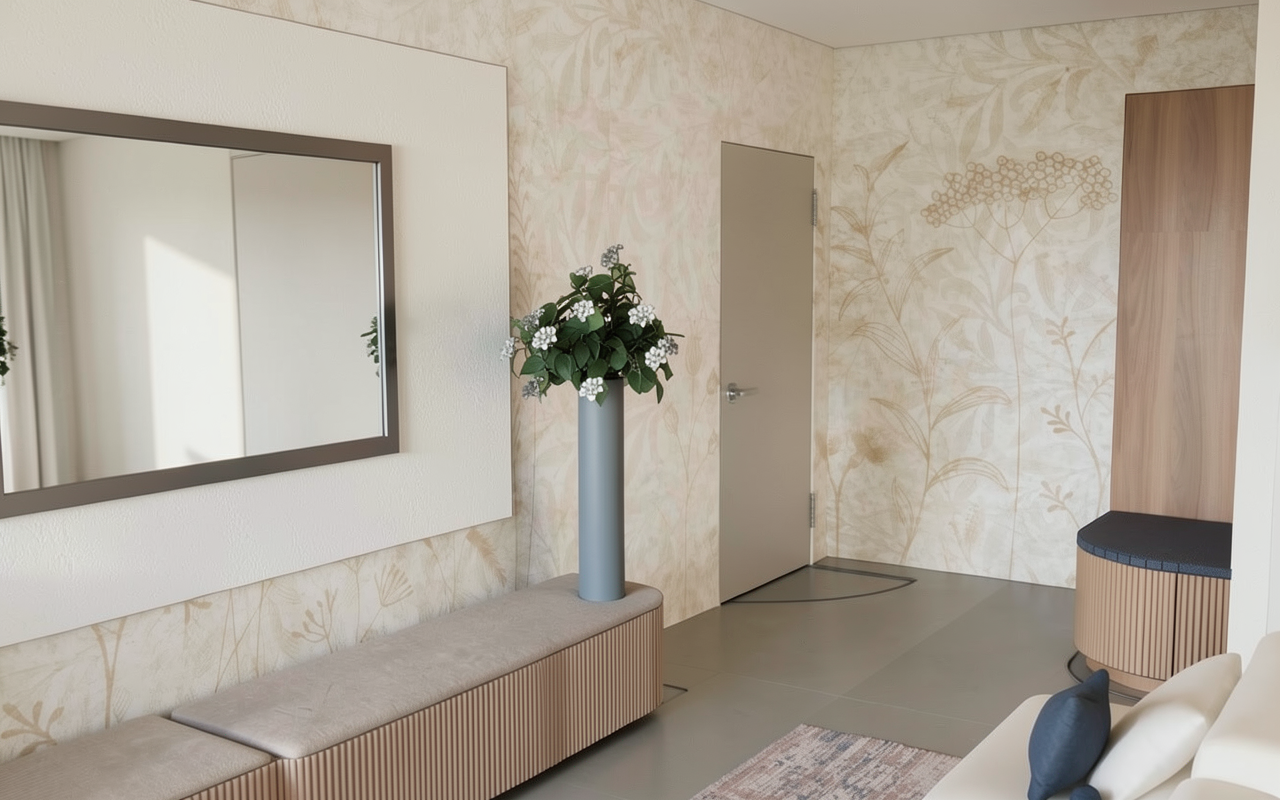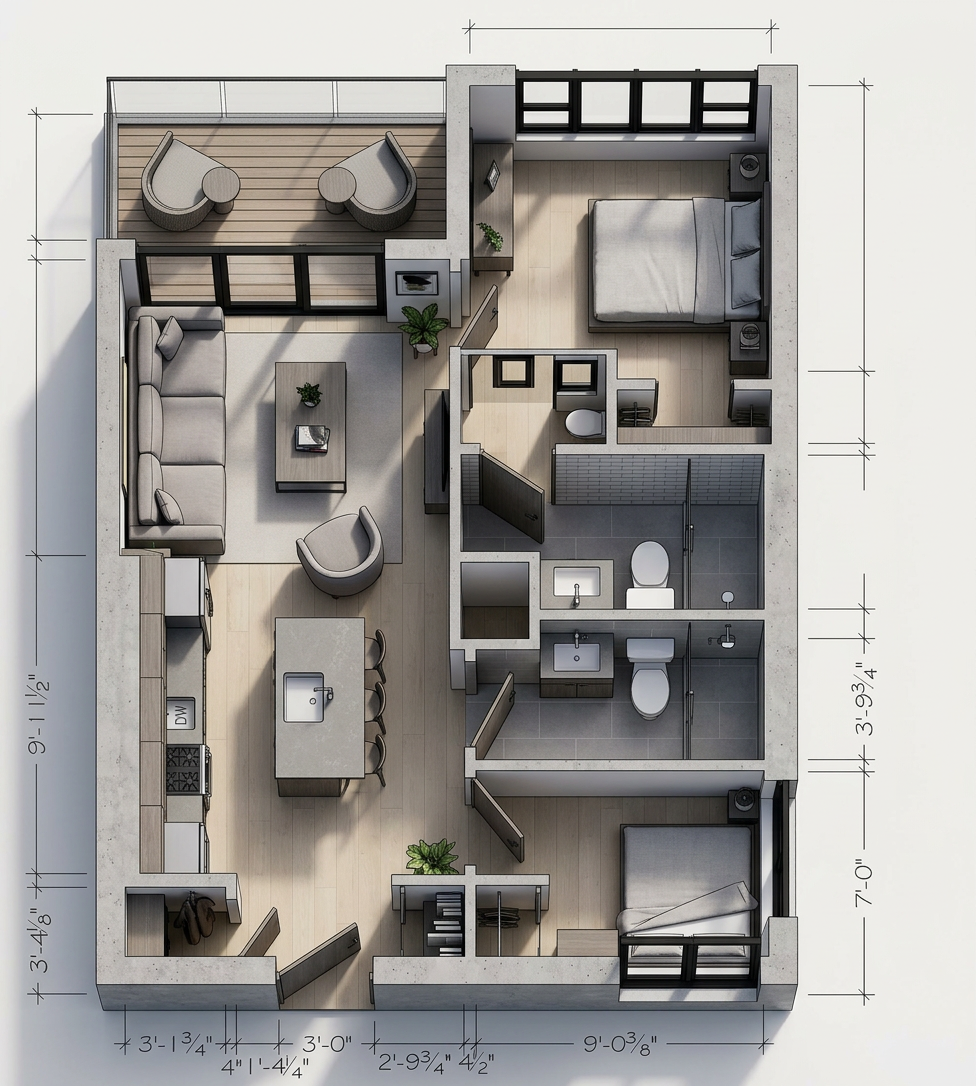 create a photorealistic 3d rendered interior visualization based strictly on the provided 2d floor plan important do not modify the layout in any way do not add remove resize or reposition any walls do not change the location size or direction of doors windows or stairs do not replace redesign or reinterpret any furniture all furniture must remain exactly as shown in the floor plan keep the exact proportions dimensions and spatial relationships the 3d render must be an accurate spatial translation of the 2d plan preserving geometry and structure precisely style modern realistic materials natural lighting high resolution architectural visualization quality the walls are painted in soft ivory providing a warm and inviting atmosphere use light oak wood for the flooring to add a touch of elegance make the bathroom with white marble tiles the windows are large allowing natural light to flood the space creating a bright and airy environment furnish the rooms with minimalist contemporary furniture in shades of warm colors and teal for a sophisticated look incorporate indoor plants with vibrant green leaves to bring life and freshness to the space use subtle warm lighting fixtures throughout to maintain a comfortable ambiance