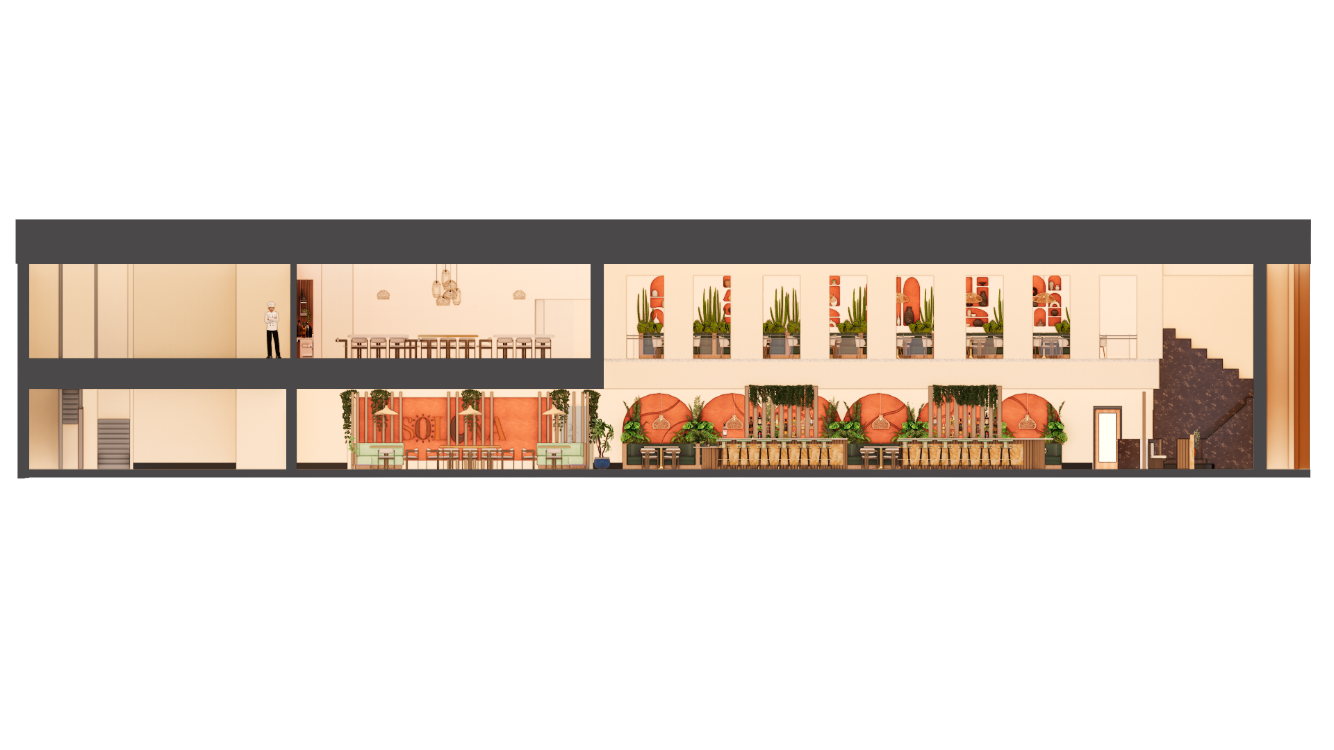 add kitchen equipent on elevation left side first and second floor not in the priv dining