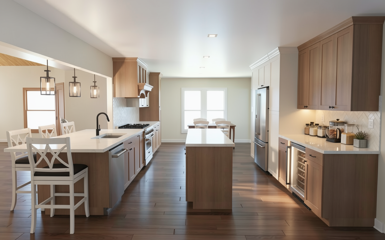 photorealistic interior architectural render of a high end coffee bar counter and rear service area based on the composition and perspective of image 11 png the atmosphere is warm inviting and luxurious with sophisticated architectural lighting and sfeervolle spotlights highlighting textures the front of the l shaped main counter is clad in tiny glistening urban olive glossy rectangular mosaic tiles from the mosaic factory the countertop is a rich dark brown natural stone quartzform style with an elegant polished finish the two cash registers monitors and two professional white espresso machines from image 11 png remain in their positions active staff and customers bring the scene to life a customer is standing at the bar ordering from a smiling barista behind a register another customer waits for their drink holding a reusable cup behind the main counter the large decorative geometric black metal room divider with half circles is filled with textured deep green fabric panels behind the two espresso machines the structure that was previously defined as cabinet units is now clearly composed of clean smooth painted partition walls no cabinet doors or handles finished in the deep brown attic 2 color from little greene parked clearly behind these new partition walls service carts mobile stainless steel and wood with wheels holding trays and supplies are visible the large wall on the right with the two black floating shelves remains covered in the heavily textured matte green vescom forte wallcovering the floor is seamless beige concrete the suspended ceiling feature directly above the bar is covered with textured felt panels in the rich deep date dark brown terracotta felt from tack tile the rest of the main ceiling surface is painted in a deep brown attic 2 color highly detailed textures glittering tiles polished stone felt fabric realistic poses and expressions of staff and customers a few detailed pastries on a wooden plank and beautiful reflections on glossy surfaces hyperrealistic 8k resolution cinematic lighting octane render