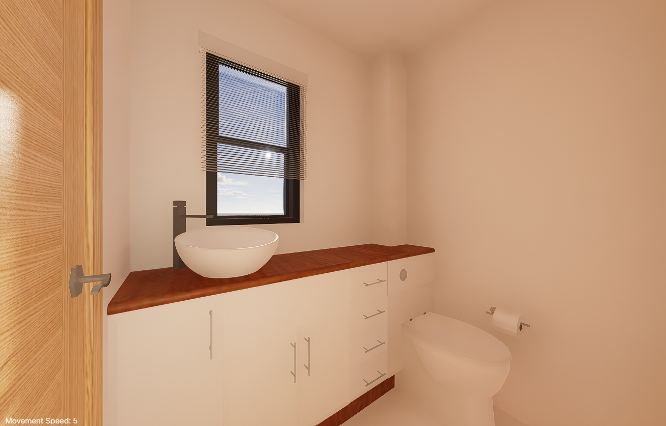 make this a modern minimalist bathroom using nutral colours and tiles on the floor with natural light coming from the window add some nice ornaments on the unit and some spotlights in the ceiling