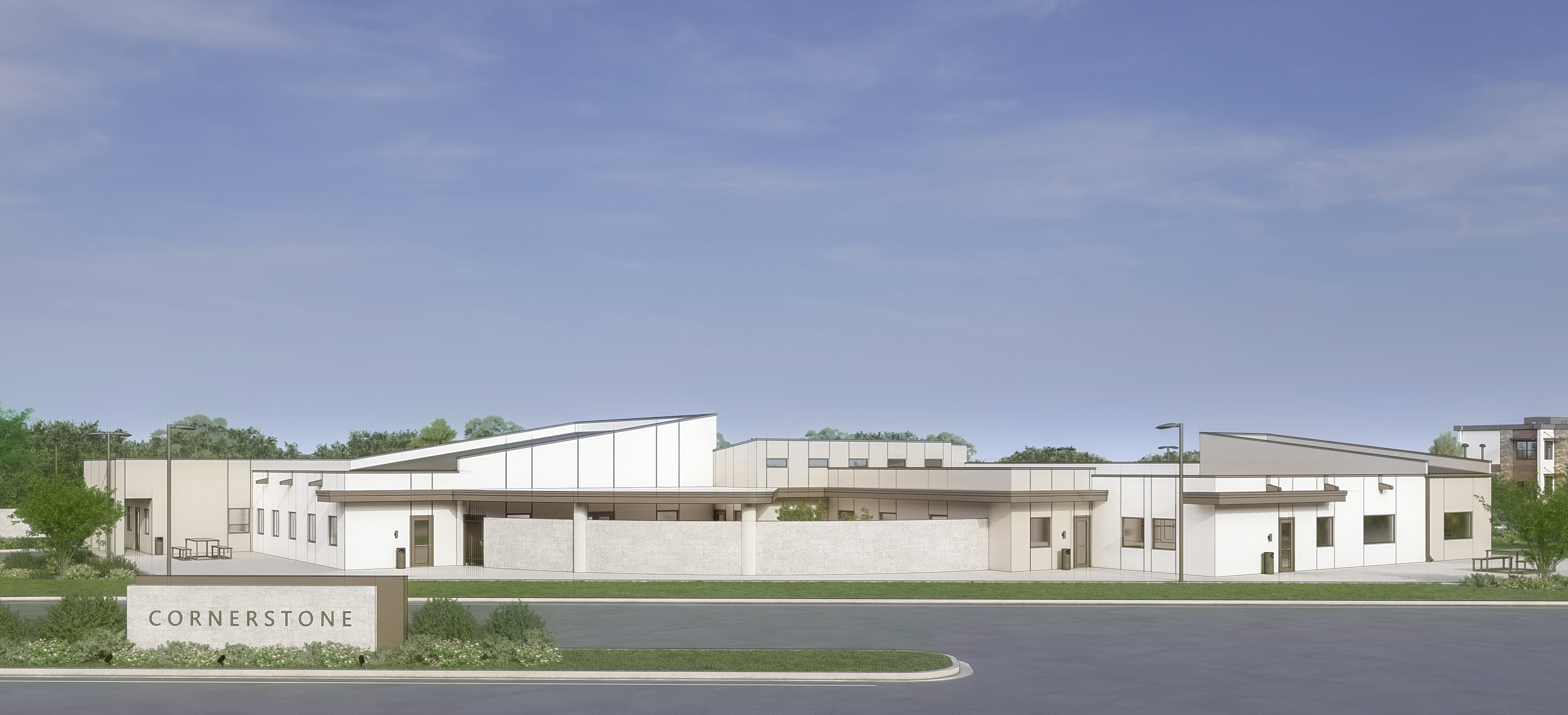 render a modern architectural building with clean lines and geometric shapes the exterior features soft white walls and light beige accents with subtle shadows the sky is a serene gradient of light blue fading into deeper blue at the top foreground features lush green trees and manicured shrubs adding a natural touch the overall atmosphere is calm and spacious with a sense of understated elegance and clarity